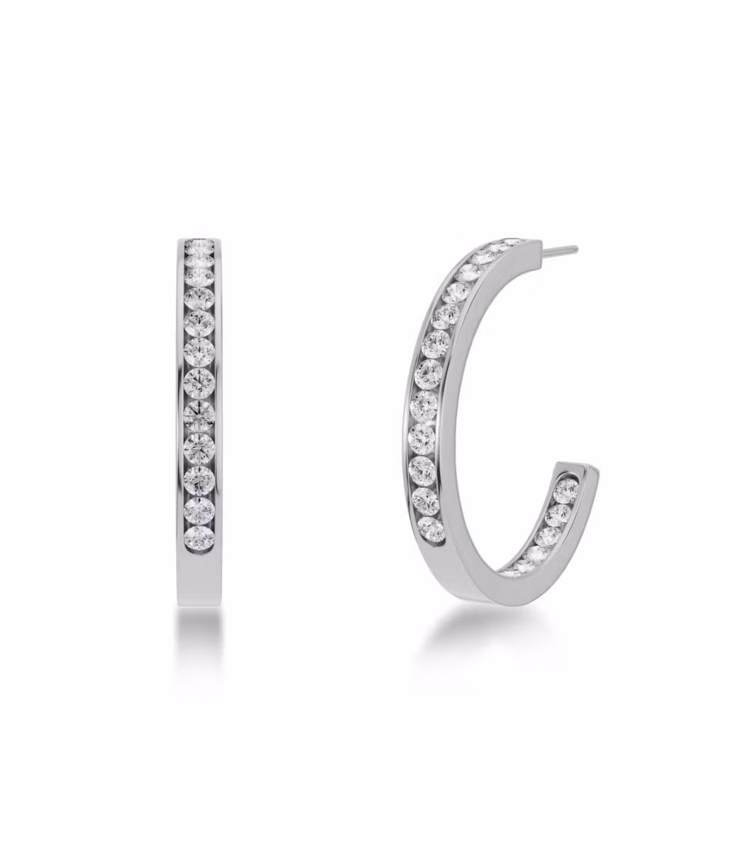 Andorra örhängen i small, har vackra stenar på både halva utsidan och insidan. I denna mellanmodell blir kombinationen av stål och klara stenar ett vackert örhänge som passar både till vardag och fest. Ses här i rosttfritt stål.