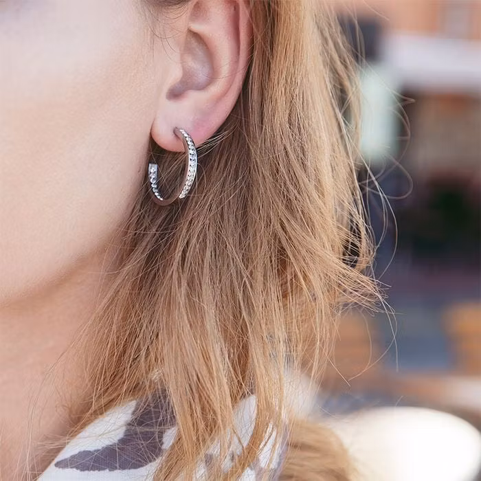 Andorra örhängen i small, har vackra stenar på både halva utsidan och insidan. I denna mellanmodell blir kombinationen av stål och klara stenar ett vackert örhä