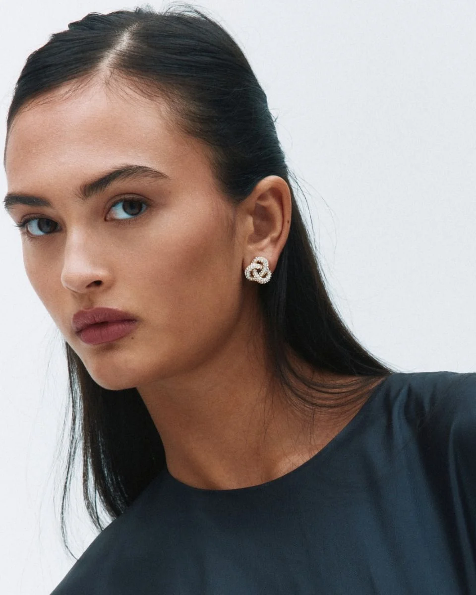 De dramatiska festörhängena i serien Infinity Knot blir partyts mittpunkt. Här med den vackra formen i 14K guldplätering beströdd med glittrande stenar.