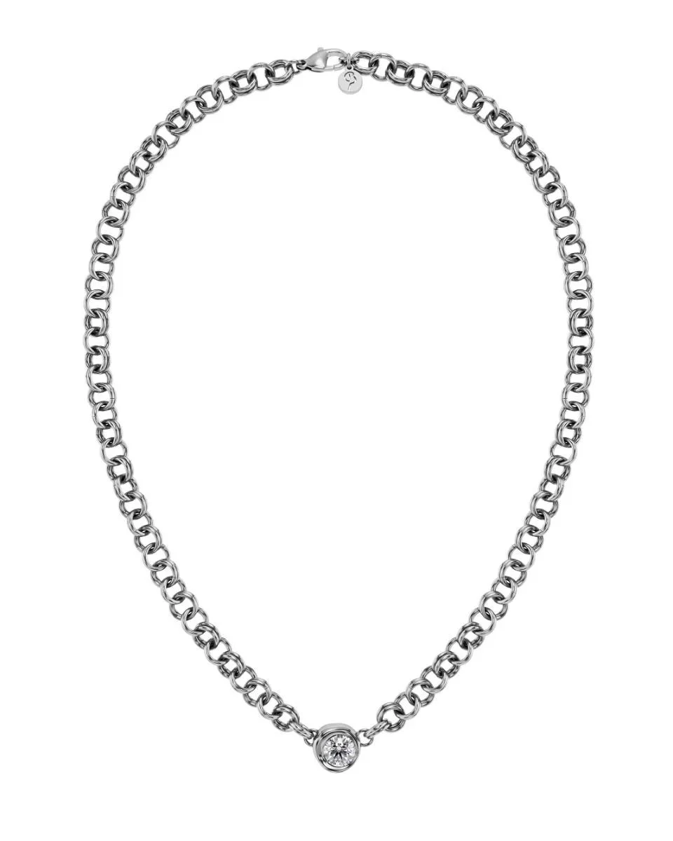 Ocean Gem bjuder på organiska former och ljusreflekterande detaljer, inspirerade av snäckors böljande konturer och solens spel på vattenytan. Det coola halsbandet har en kraftig kedja med dubbla länkar, här i blankt rostfritt stål, med en stor, vacker glittrande sten mitt på.
