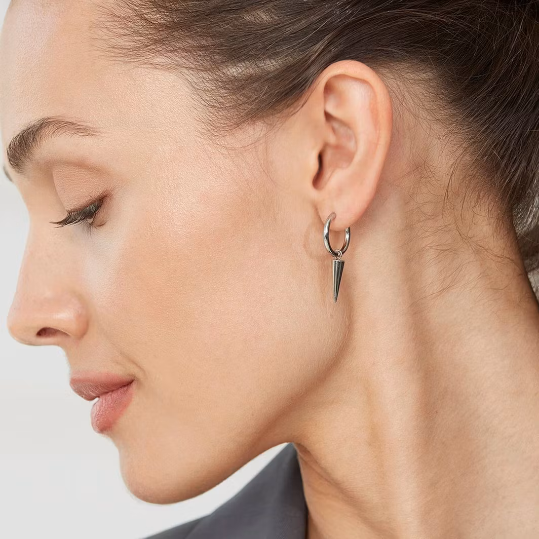 Fina Peak hoops har en långsmal nit hängande i ringen som ger ett härligt effektfullt örhänge. I Peak hoops kan man ta av niten och bara använda hoopsen som de är, eller hänga på något mer om man vill. Peak hoop ses här i blankt rostfritt stål. Kolla också in andra delar i serien Peak.