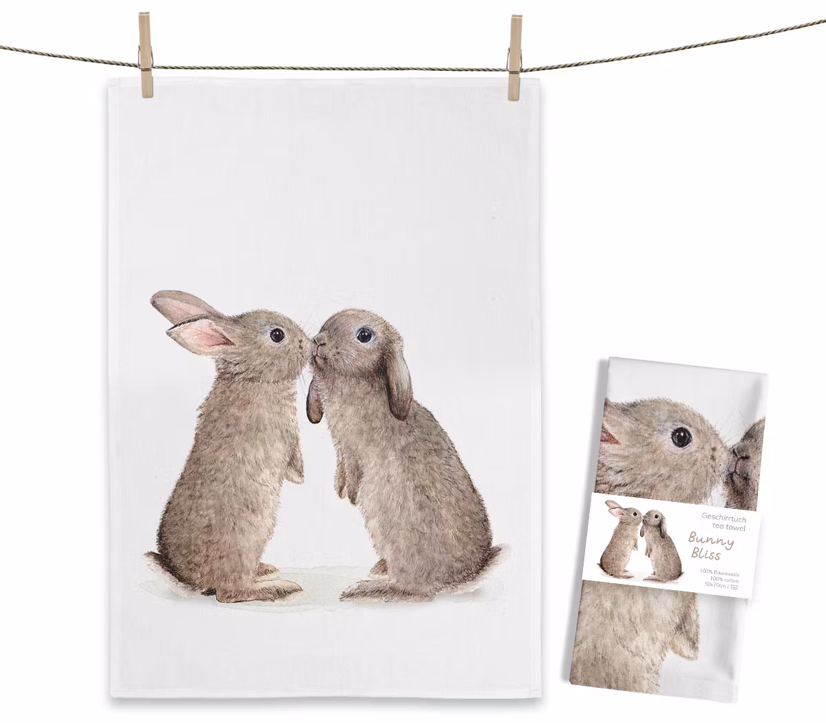 Charmiga kökshanddukar i ren bomull med motiv av två kaniner som pussas. Fler motiv finns.