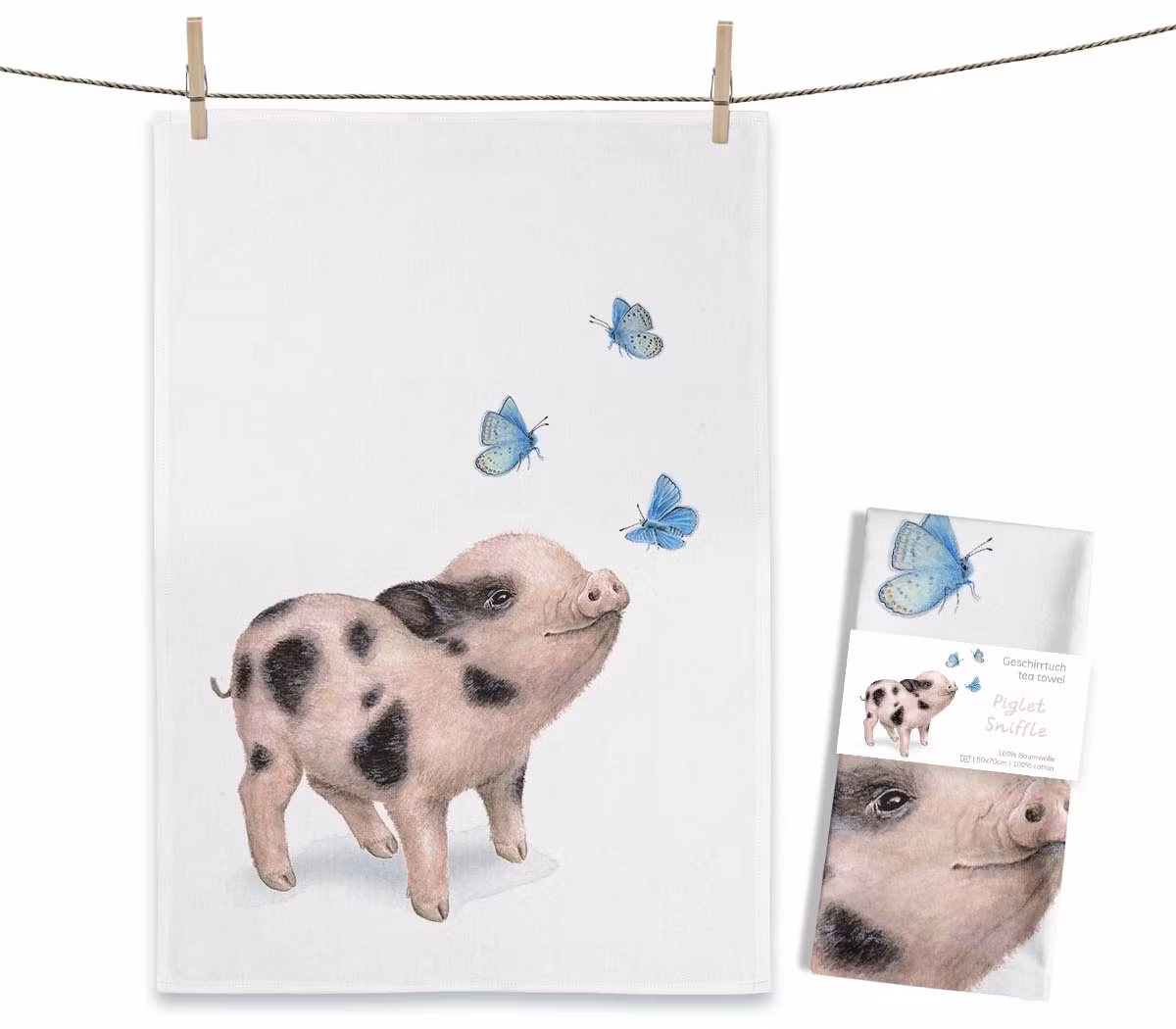 Charmiga kökshanddukar i ren bomull med motiv av en liten griskulting med fjärilar runt sig. Fler motiv finns.