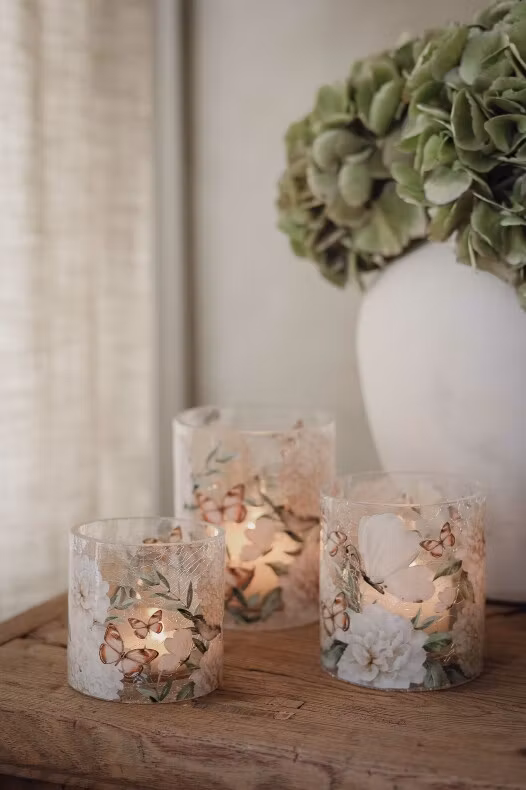 Finish Handgjord krackelerad glaslykta med mönster av vackra Hortensior och Fjärilar