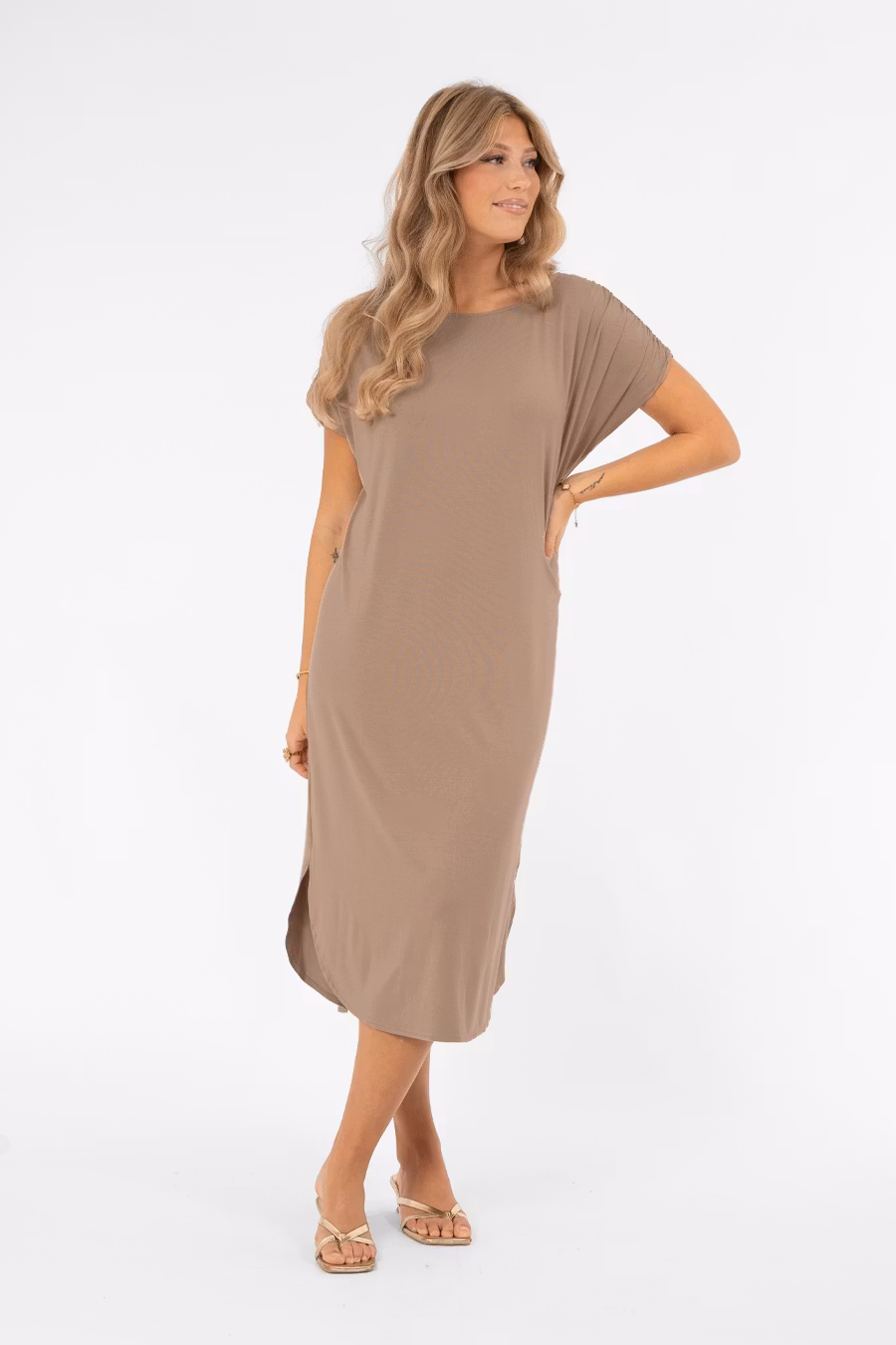 Säsongens skönaste klänning – Ellery! En trikåklänning med ledig och bekväm passform som kan bäras som den är eller markeras i midjan med det medföljande bältet för en smickrande siluett. Klänningen har en båtformad halsringning och lätt utställda axelsömmar som ger en nätt ärm. Ett resårband i axelsömmen skapar en elegant rynkdetalj. Nederkanten är rundad med små slitsar i sidorna, vilket ger en avslappnad men ändå sofistikerad finish. En feminin och mångsidig trikåklänning som passar perfekt till vardag, kontor eller avslappnade festliga tillfällen.