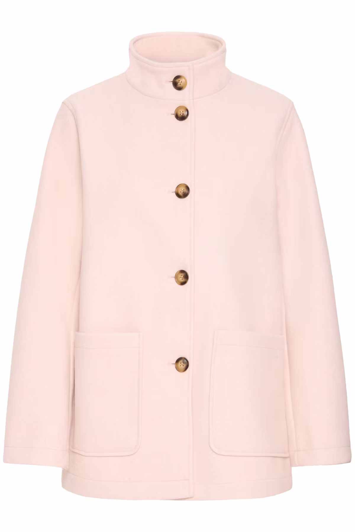 Sååå vårfin jacka med ullkänsla. Perfekt mellansäsongsjacka med stora utanpå fickor. Ståkrage, så kallad skorstenskrage och stora knappar i brun/beige. Ljuvligt mjuk och skön i en perfekt puderrosa nyans. Stor i storleken, du kan välja en storlek mindre än din vanliga.