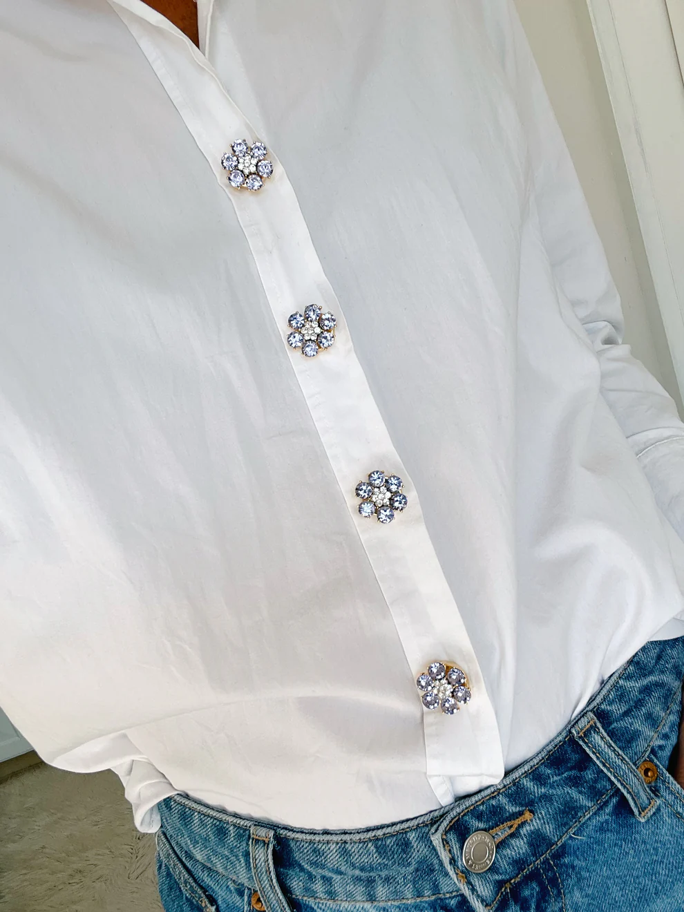 Placera en vid kragen som ett fint smycke eller flera längs knappslån för en lyxig helhet.