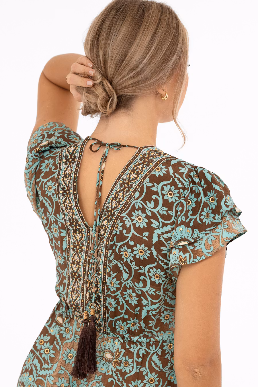 Vacker blommig klänning i bruna och turkosa toner med glittrande inslag av guld. Klänningen är v-ringad både fram och bak, där du själv kan justera bredden med knytband och toffsar i nacken. Avskärningen under bysten har knytband med toffsar fram samt mjuk resår bak för en smickrande passform. Kjoldelen är utställd och avslutas med en bred volang i nederkant, rundad och något kortare framtill för ett lekfullt uttryck. Fjärilsärmarna är gjorda i två lager med subtilt rynk på axeln, vilket ger extra volym och en elegant, feminin siluett. En romantisk och festlig klänning som passar perfekt till vardag, fest och sommarens alla tillställningar.