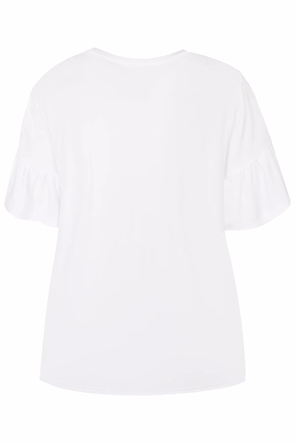 Härlig vit t-shirt med volangärm.5% elastan, 95% viskosFinns i storlek S-XXLLängden är 66 cm i storlek MArtikelnummer: 500689Zeze