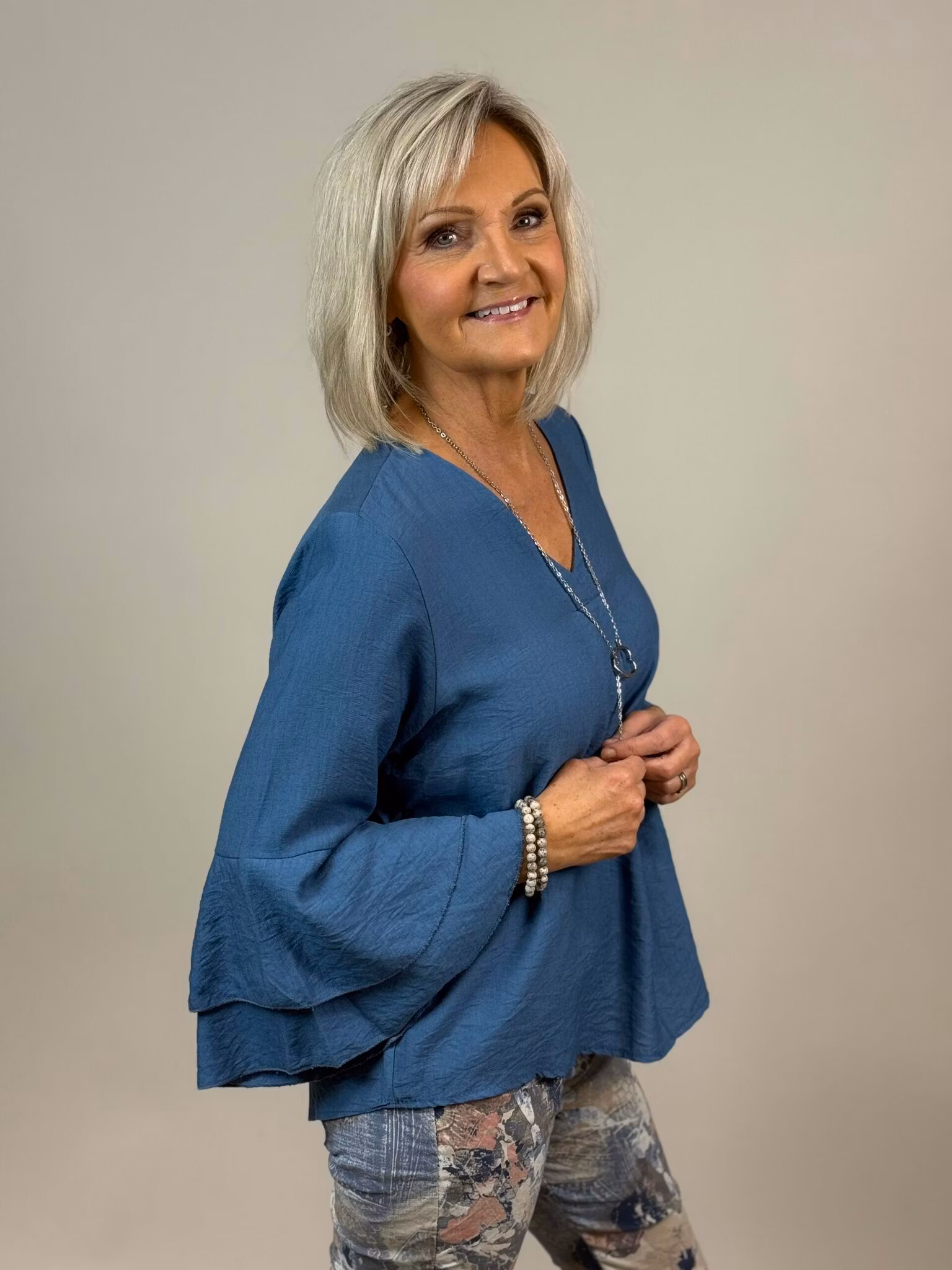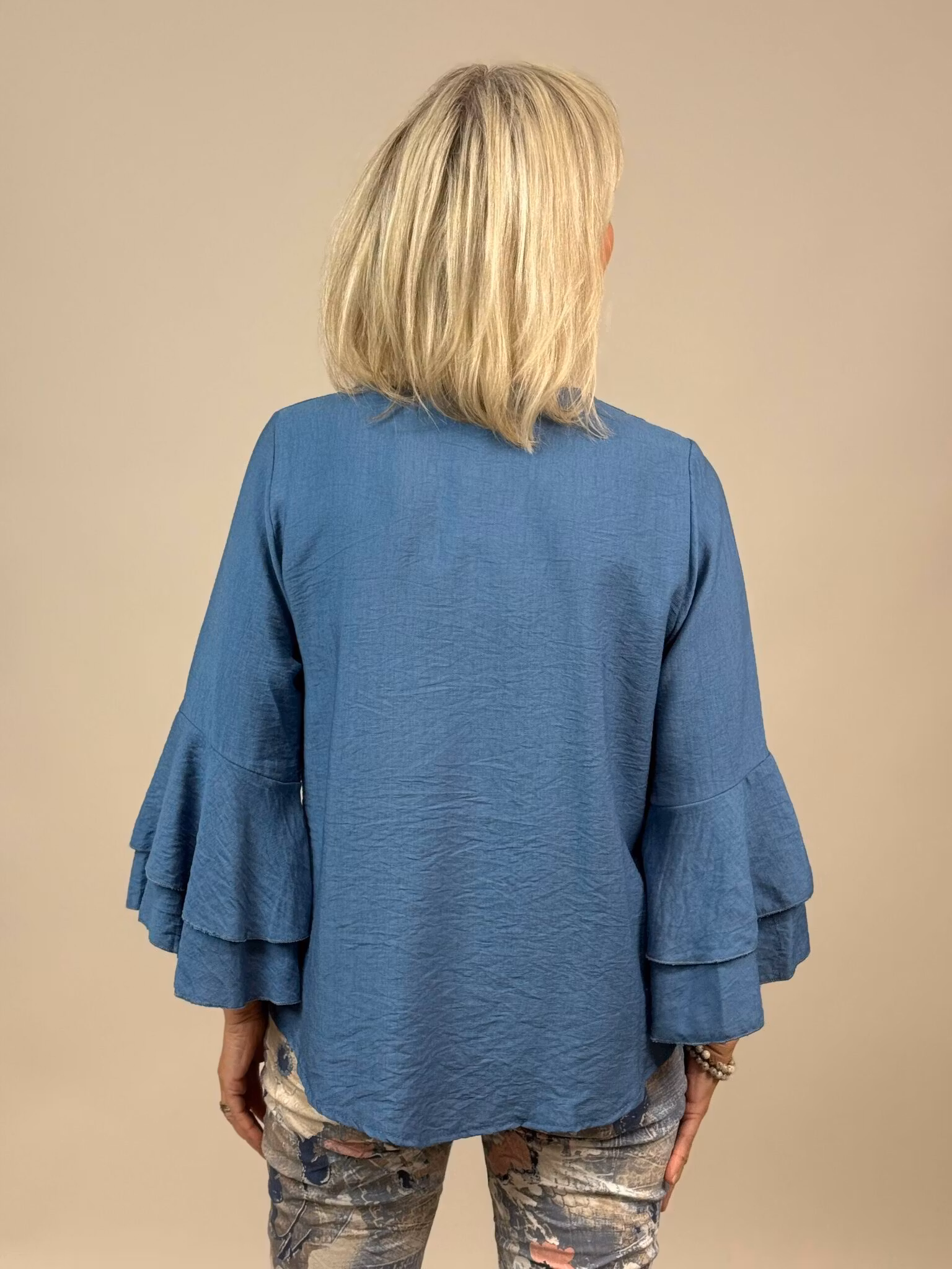 Fin blus i härlig viscosekvalitet med lätt struktur i tyget. V-ringad blus med veck och stor dubbel volang på ärmen som har en 3/4-dels längd. Rundad nederkant, något längre bak än fram.