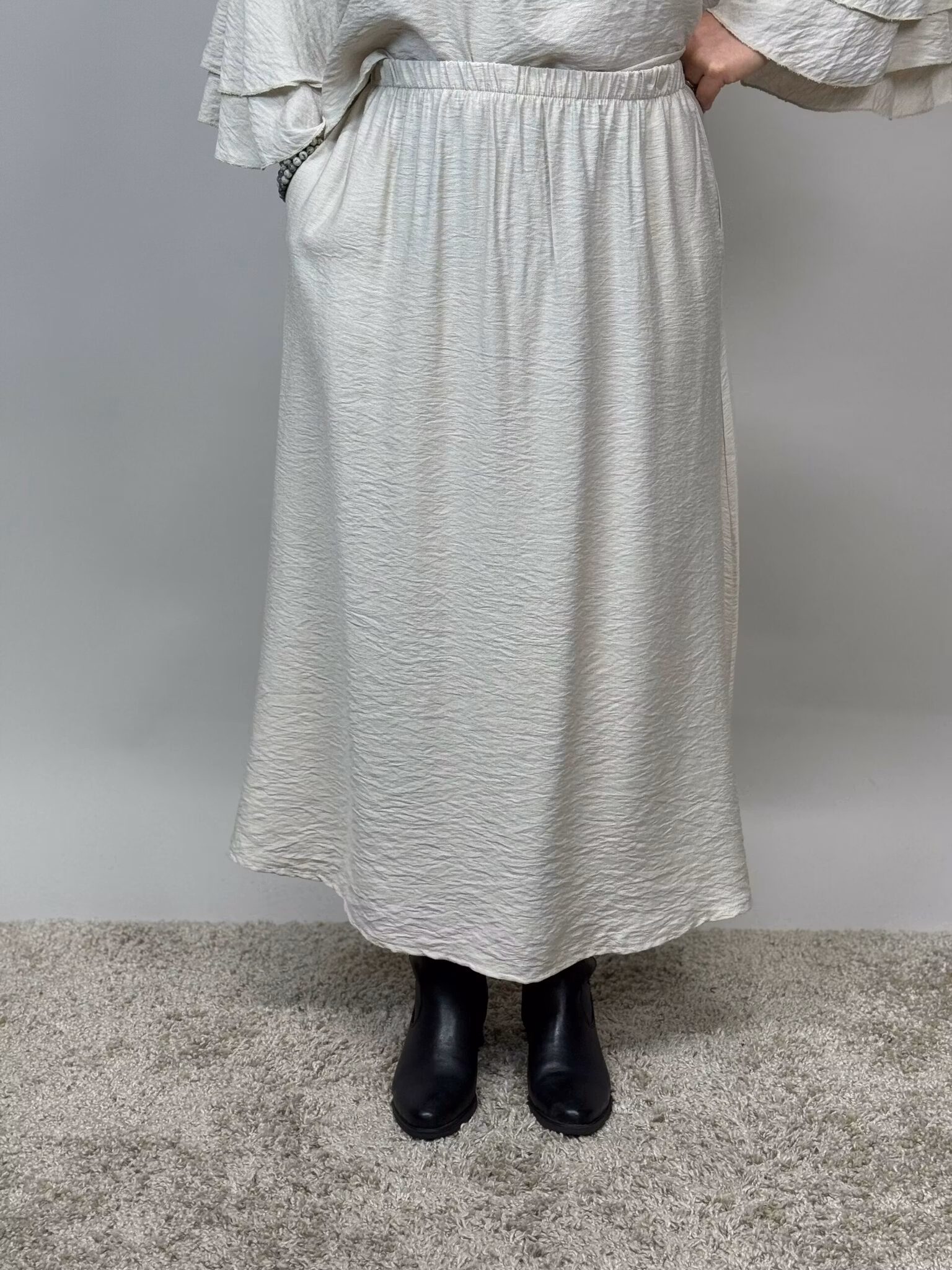 Fin kjol härlig viscosekvalitet med lätt struktur i tyget. Resår i midjan, a-linjeformad modell men fickor i sidorna.