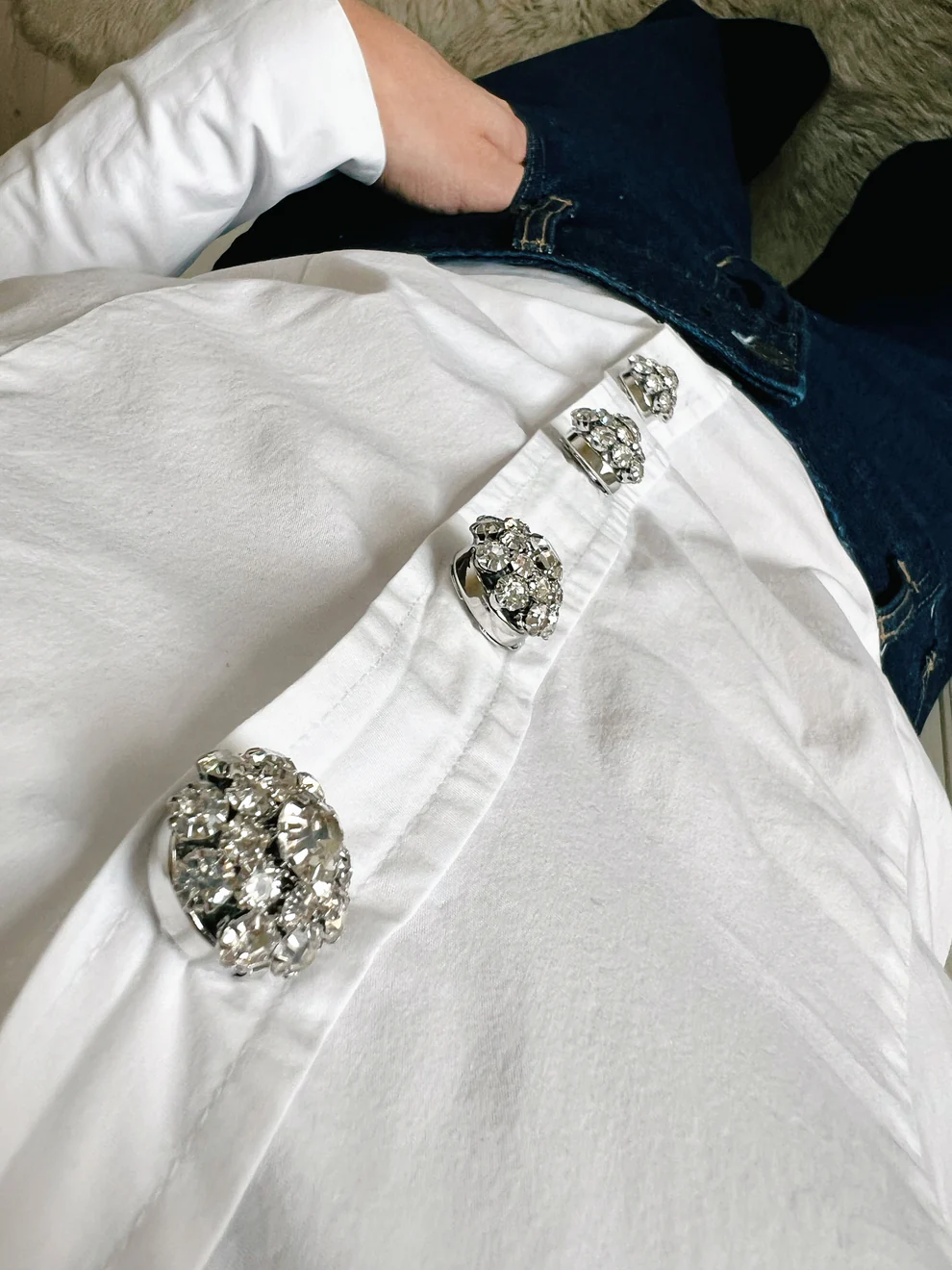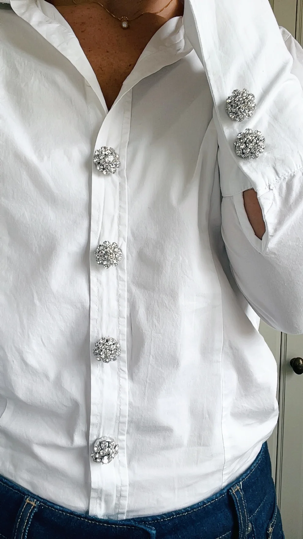 Placera en vid kragen som ett fint smycke eller flera längs knappslån för en lyxig helhet.