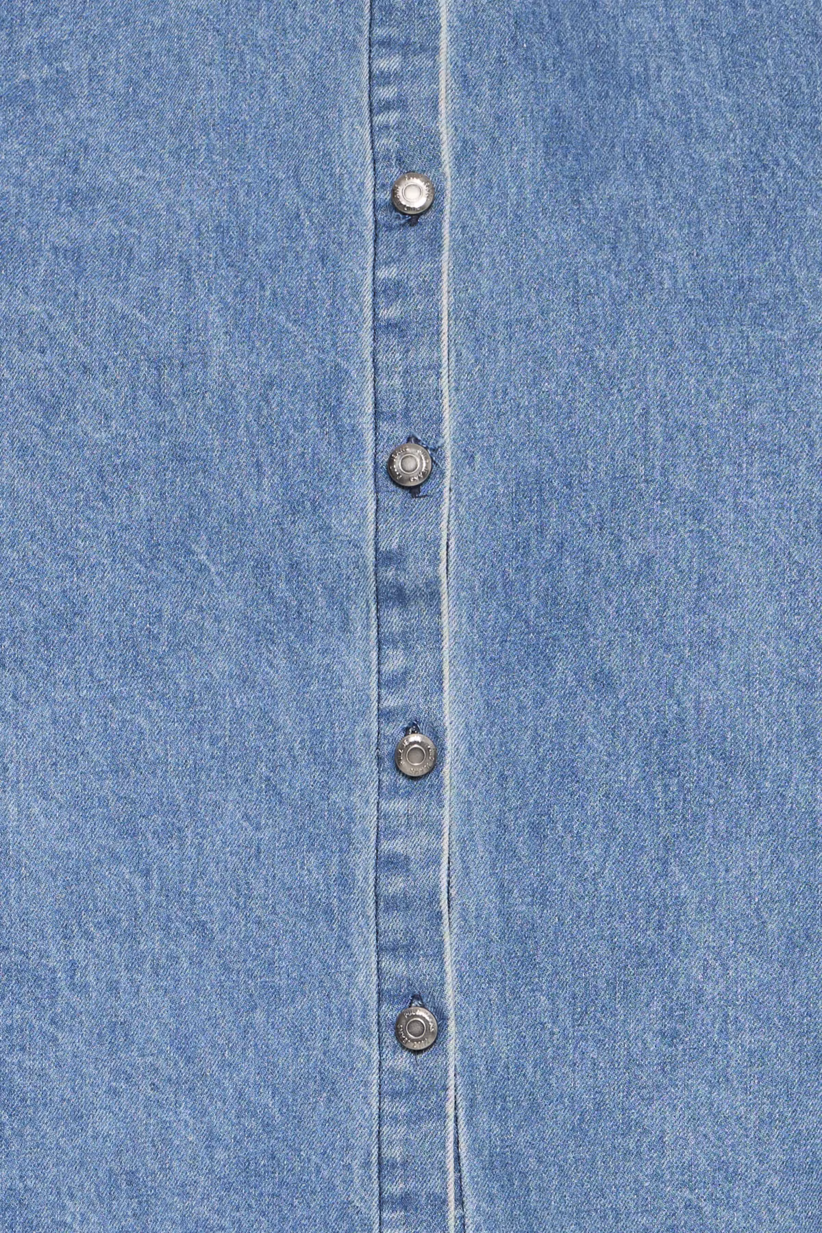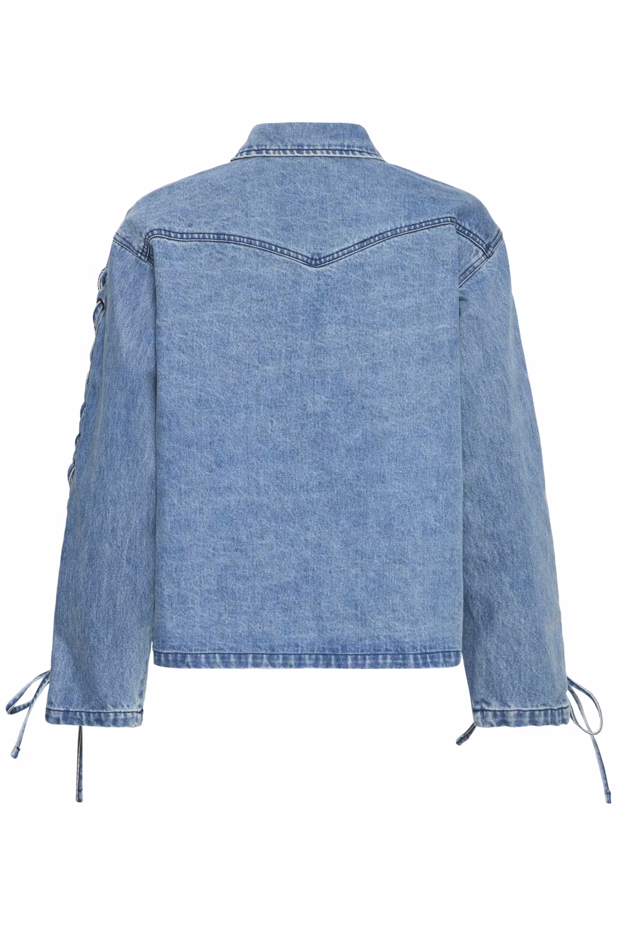 Cool skjortjacka i jeans med tuff snörning på ärmarna. Klassisk skjortkrage och knäppning med snygga mörkgrå jeansknappar. Kraftigt jeanstyg som gör den till en perfekt vår- och sommarjacka. Men även snygg att bäras inomhus istället för en kofta eller kavaj.
