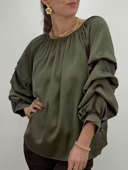 Härlig glansig blus i djup mossgrön med ackra volymärmar som ger en sofistikerad men lekfull känsla. Perfekt för både vardag och fest, där den glänsande ytan lyfter din stil och gör varje outfit speciell