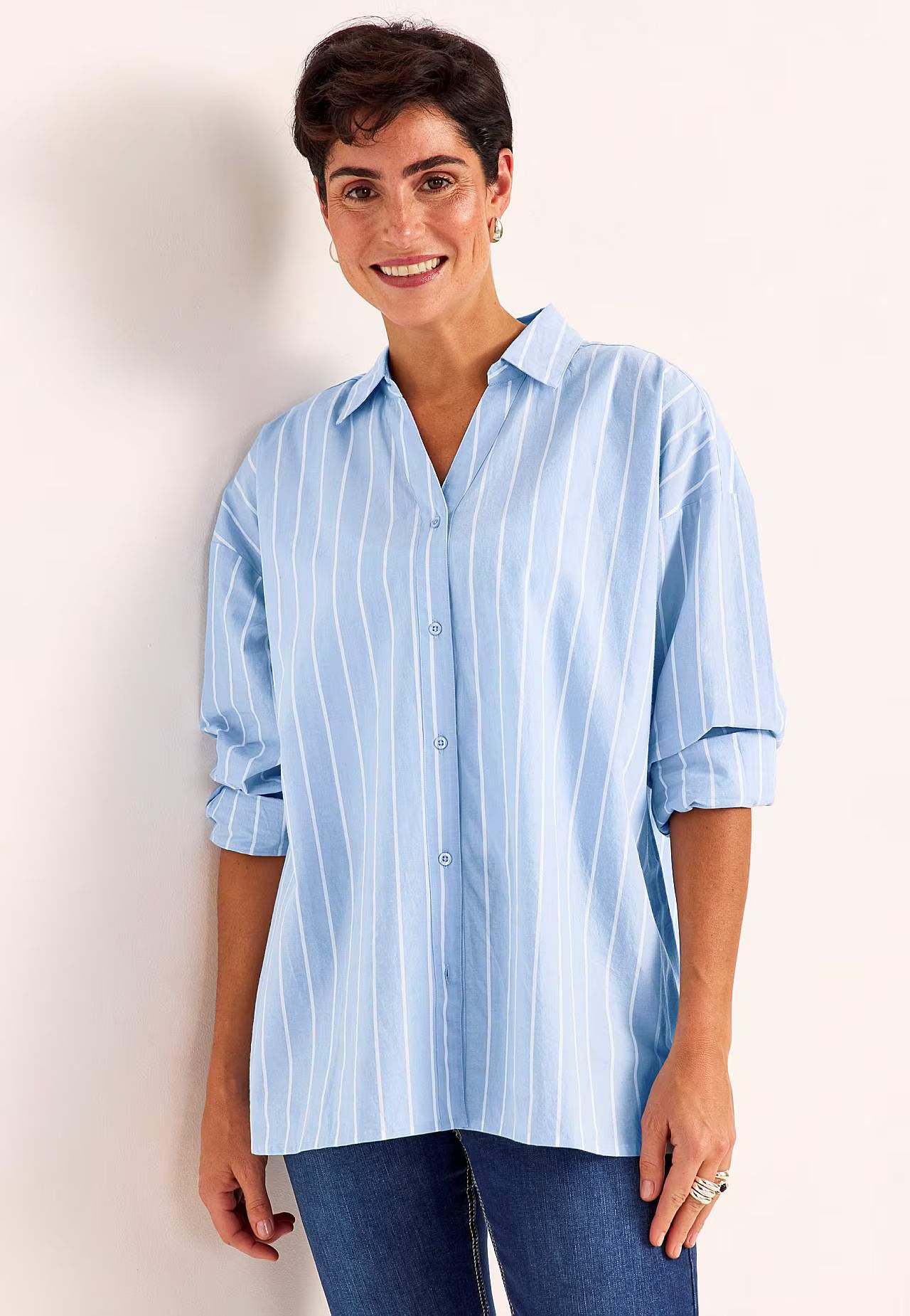 Snygg klassisk skjorta med blåvita ränder i längre modell. Klassisk krage och lätt v-ringning fram. Genomknäppt modell med nedhasad axel. Långa ärmar med manchett och knappar. Ok baktill och rundad nederkant, något längre baktill.