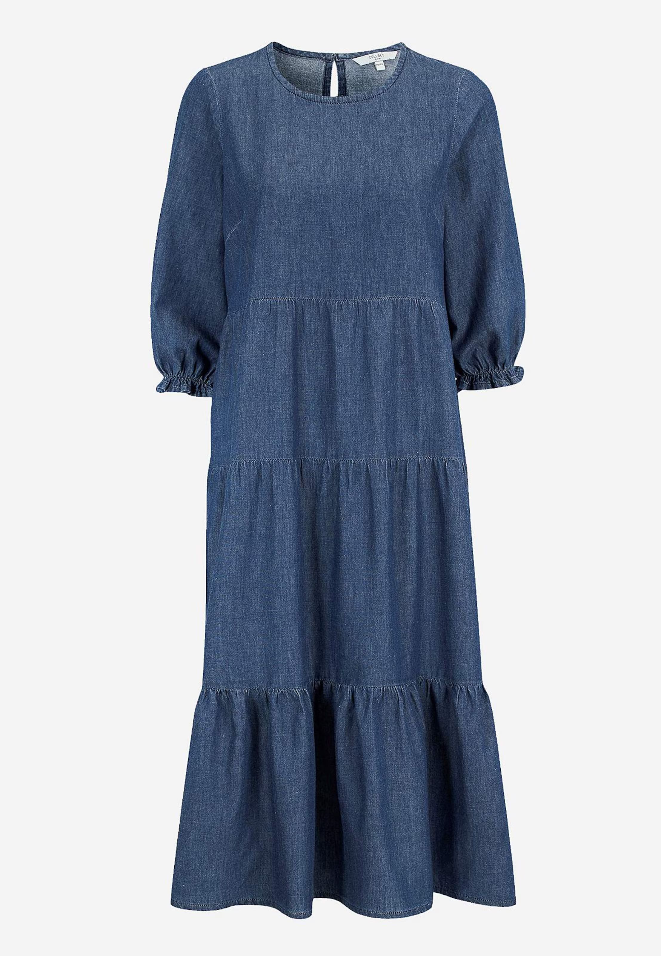 Fin jeansklänning i 100% ren bomull. Rundhalsad modell som är sydd i våder. Lös passform och normal i storleken. 3/4-dels ärm med resår i nederkant och liten volangkant. Längden följer storleken ca 120-136 cm från axeln.
