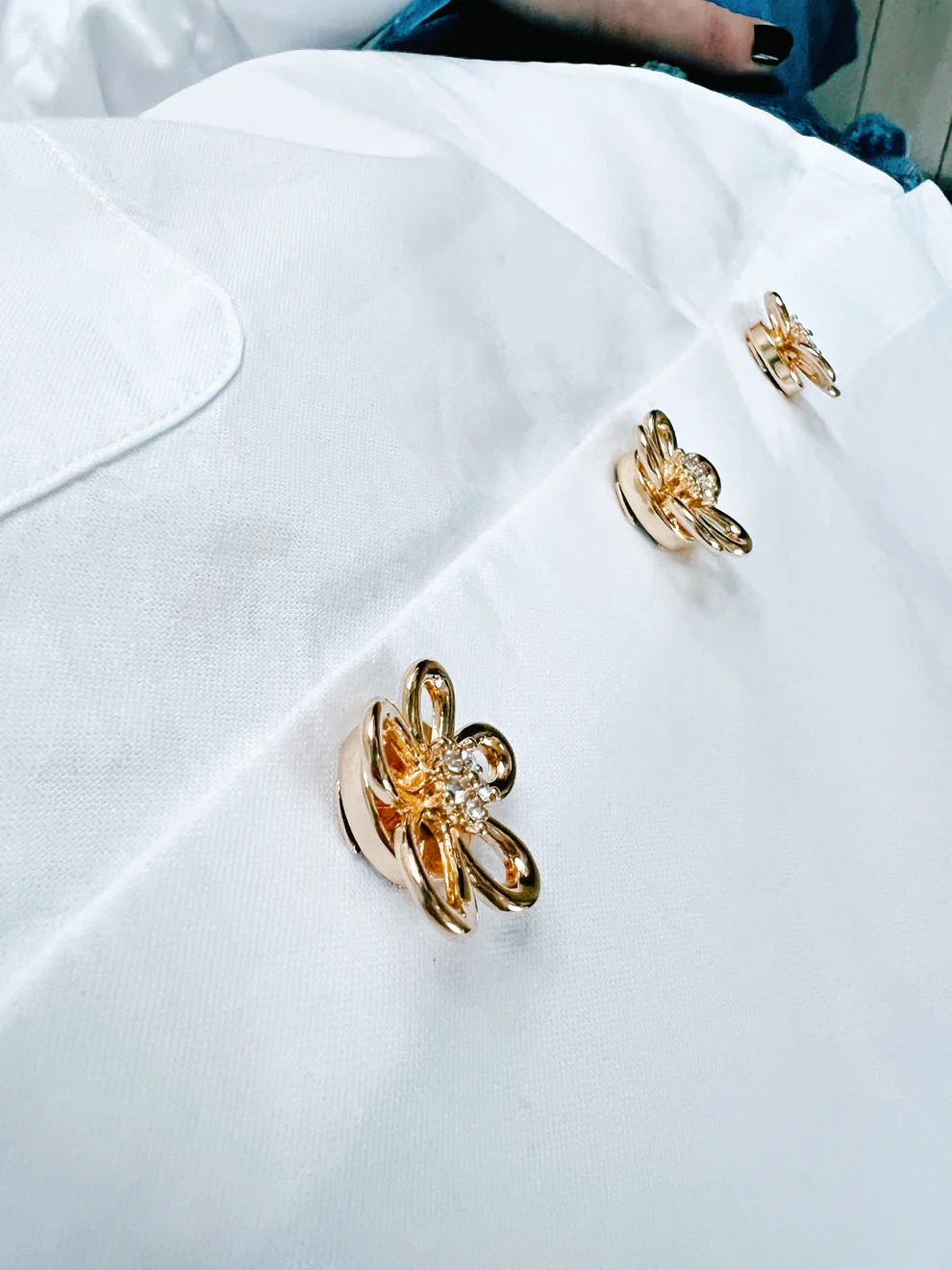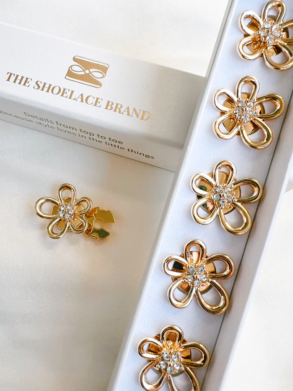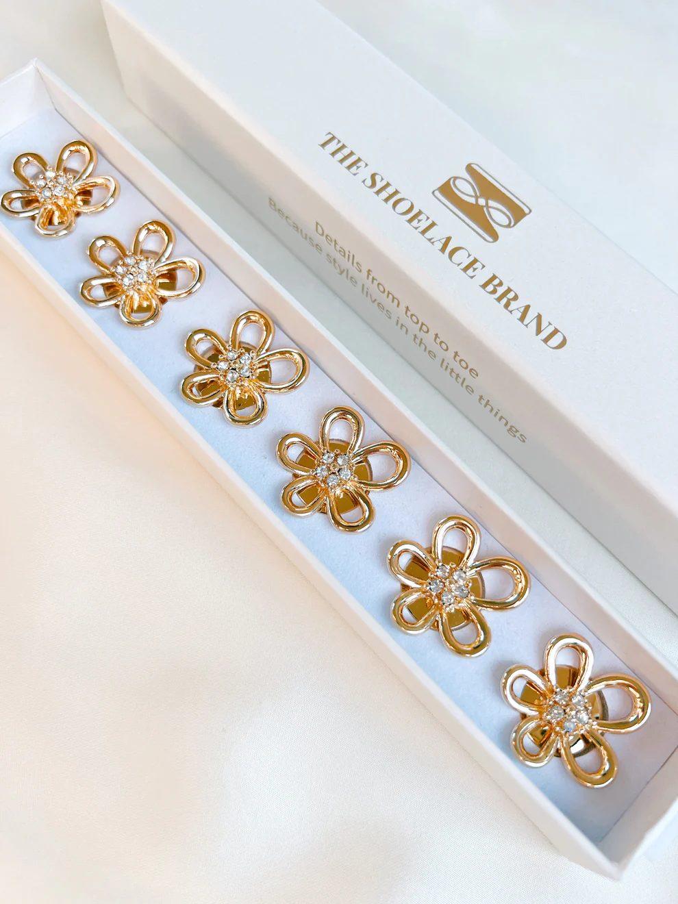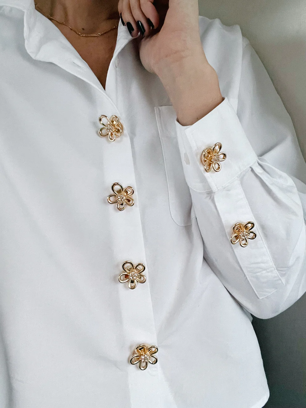 Tina är en blomformad knappcharm med guldfärgat underrede och öppna guldfärgade kronblad som ramas in av små, glittrande kristaller i mitten. Klicka fast den över en vanlig skjortknapp (upp till 13 mm i diameter) och låt din outfit glittra med en skimrande elegans.