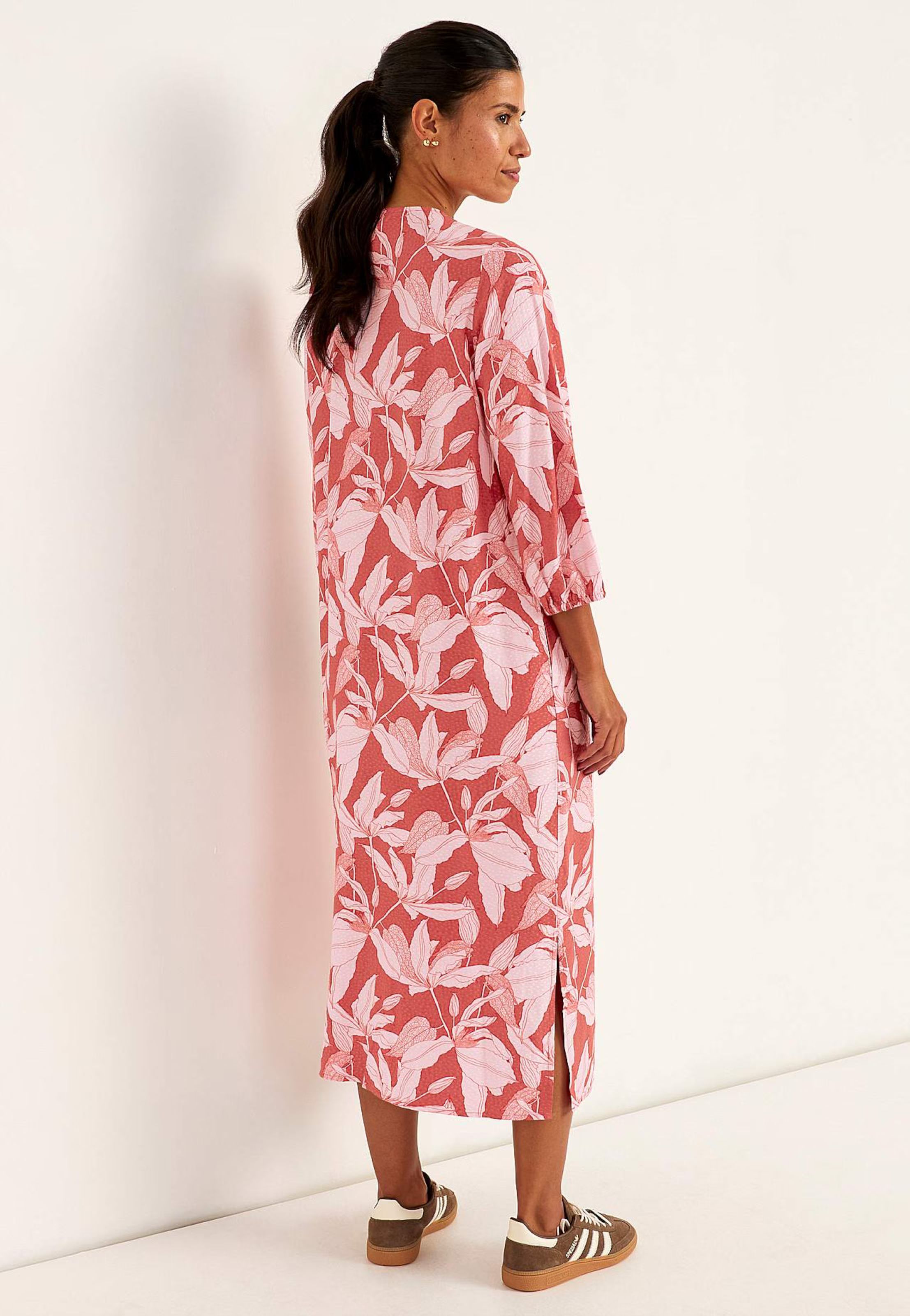 Härlig klänning med fint fall i lätt och luftig viscose. Genomknäppt rak modell med fickor i sidan och rak nederkant med slitsar i sidorna.Fin v-ringning och en ärm som slutar strax under armbågen med resår i ärmslutet.