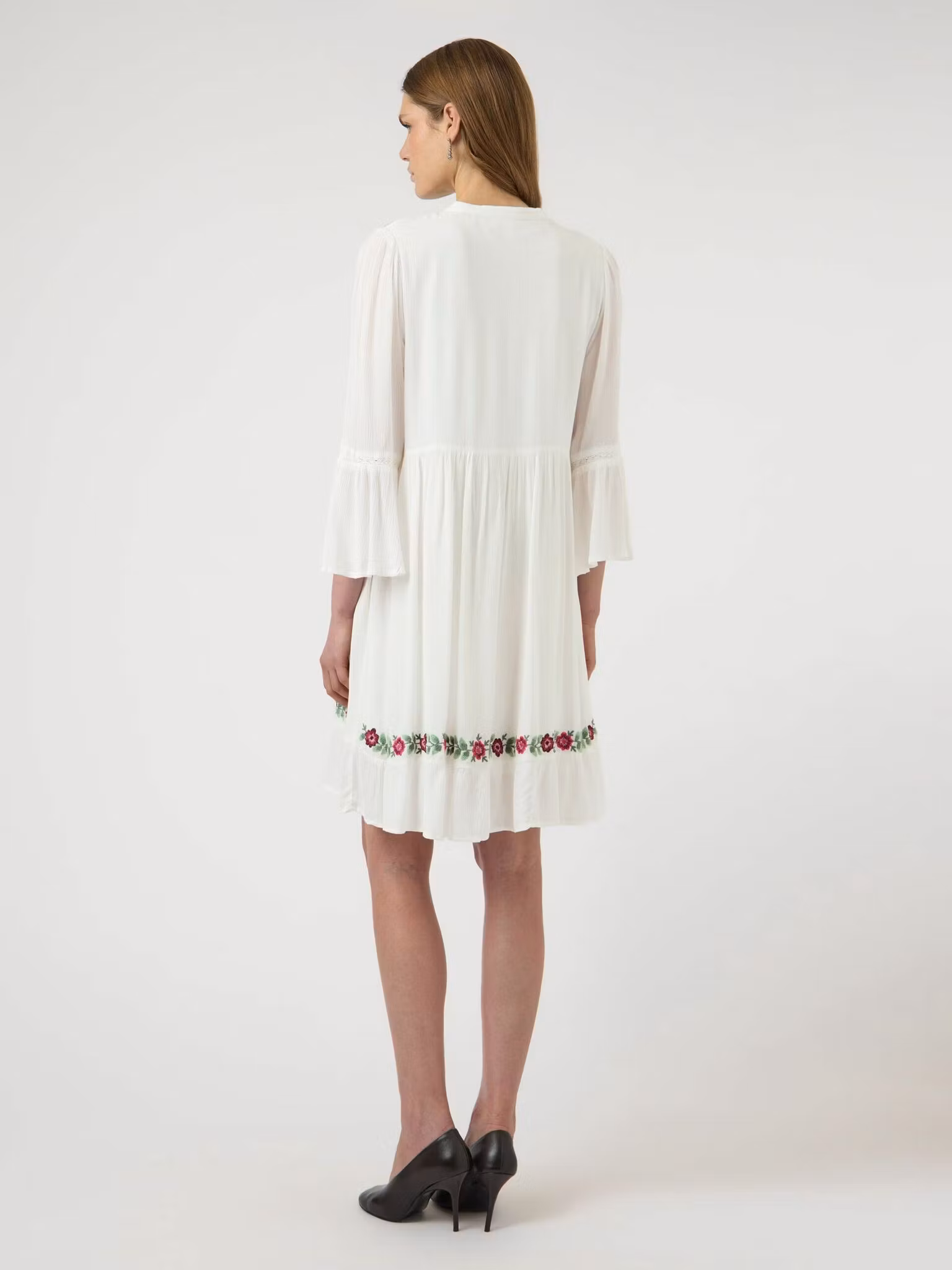 Romantisk boho-inspirerad kort klänning med blombrodyr i rosa/vinrött och grönt. Rundhalsad med sprund i ringningen och fint knyt med tofsar i ändarna. Fina infällningar med bomullsspets på ärmarna och framstycket. Klänningen är i krinklad viscose och har en isydd underklänning av polyester. 3/4-dels trumpetärm och volang nedtill.