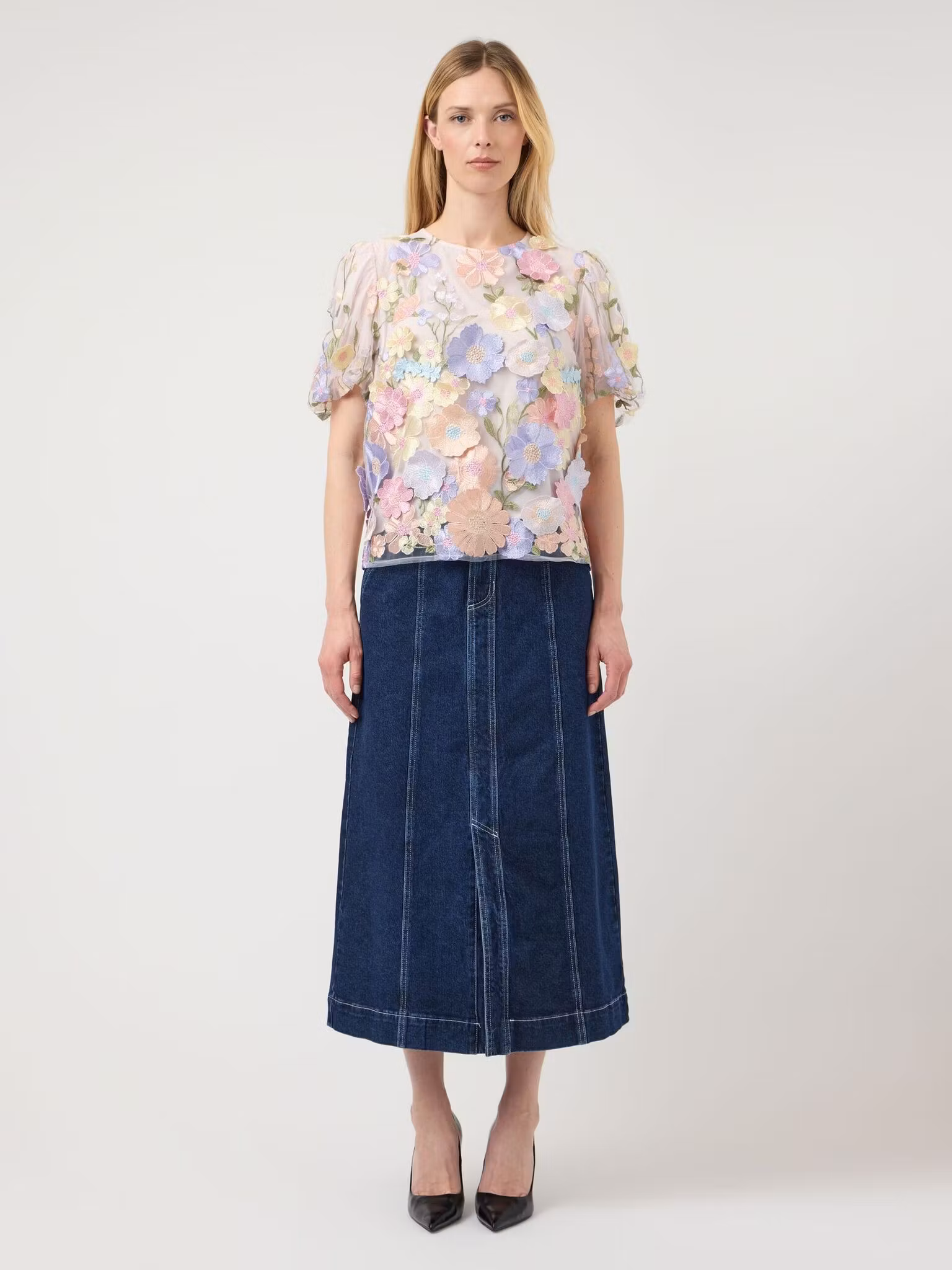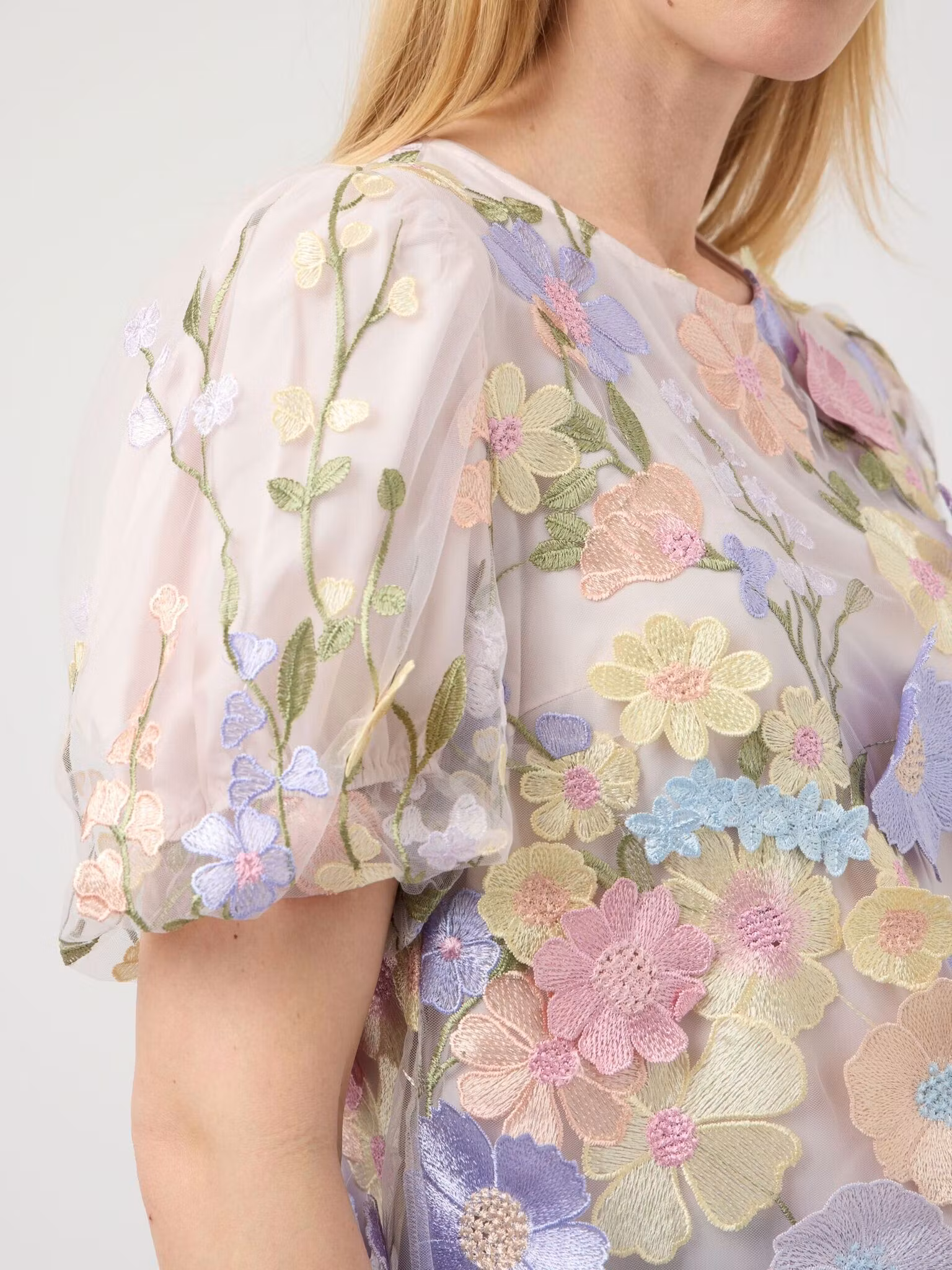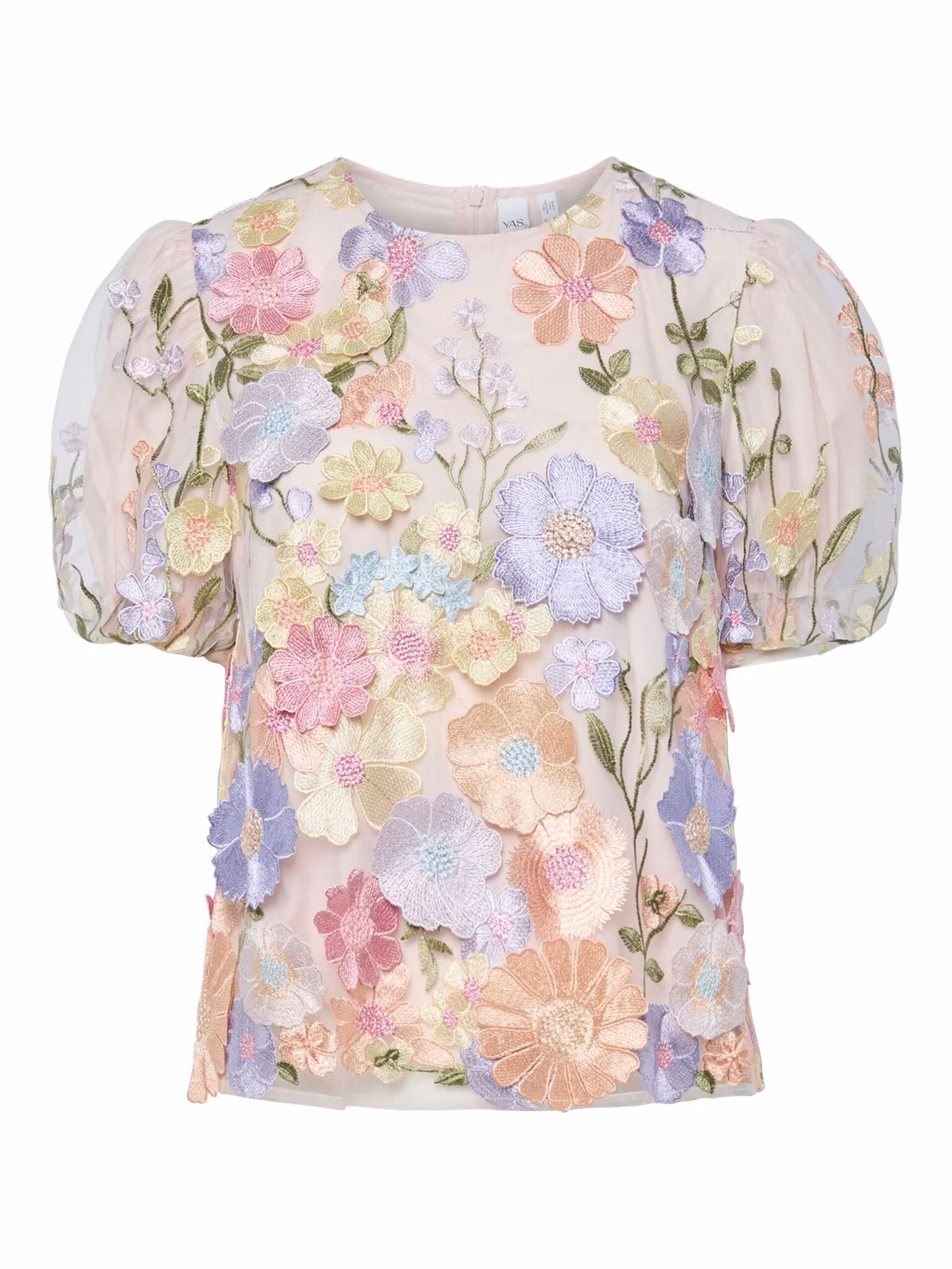 Säsongens finaste topp till årstidens alla festliga tillfällen. Ljust puderrosa botten med påsydda blommor i textil i söta pastellfärger som rosa, ljuslila, korall, gröna och gula toner. Toppen är rundhalsad och har en kort puffärm och dragkedja i nacken. Vi upplever att toppen är något liten i storleken så ligger du mellan två storlekar rekomenderar vi att du går upp en storlek.