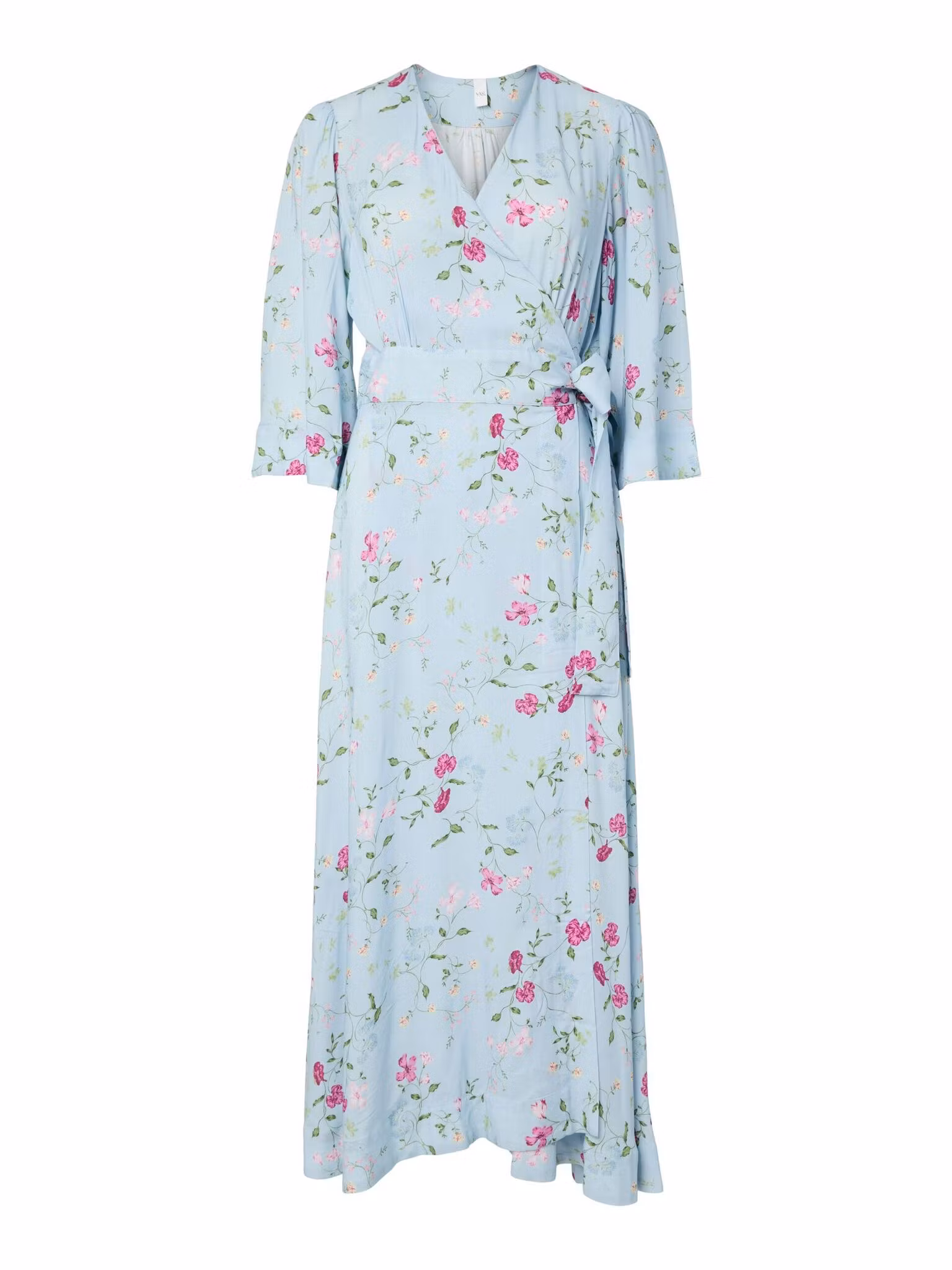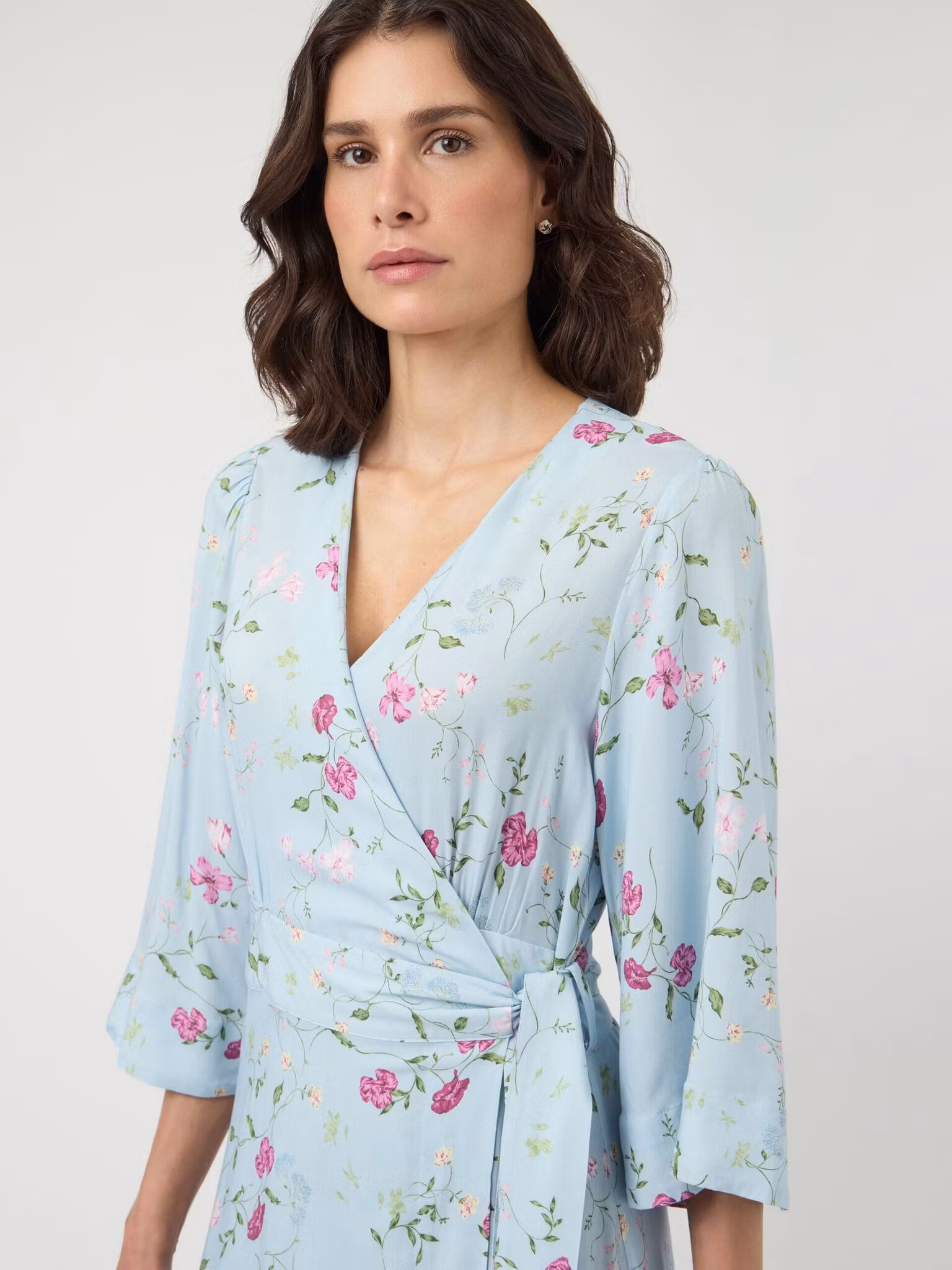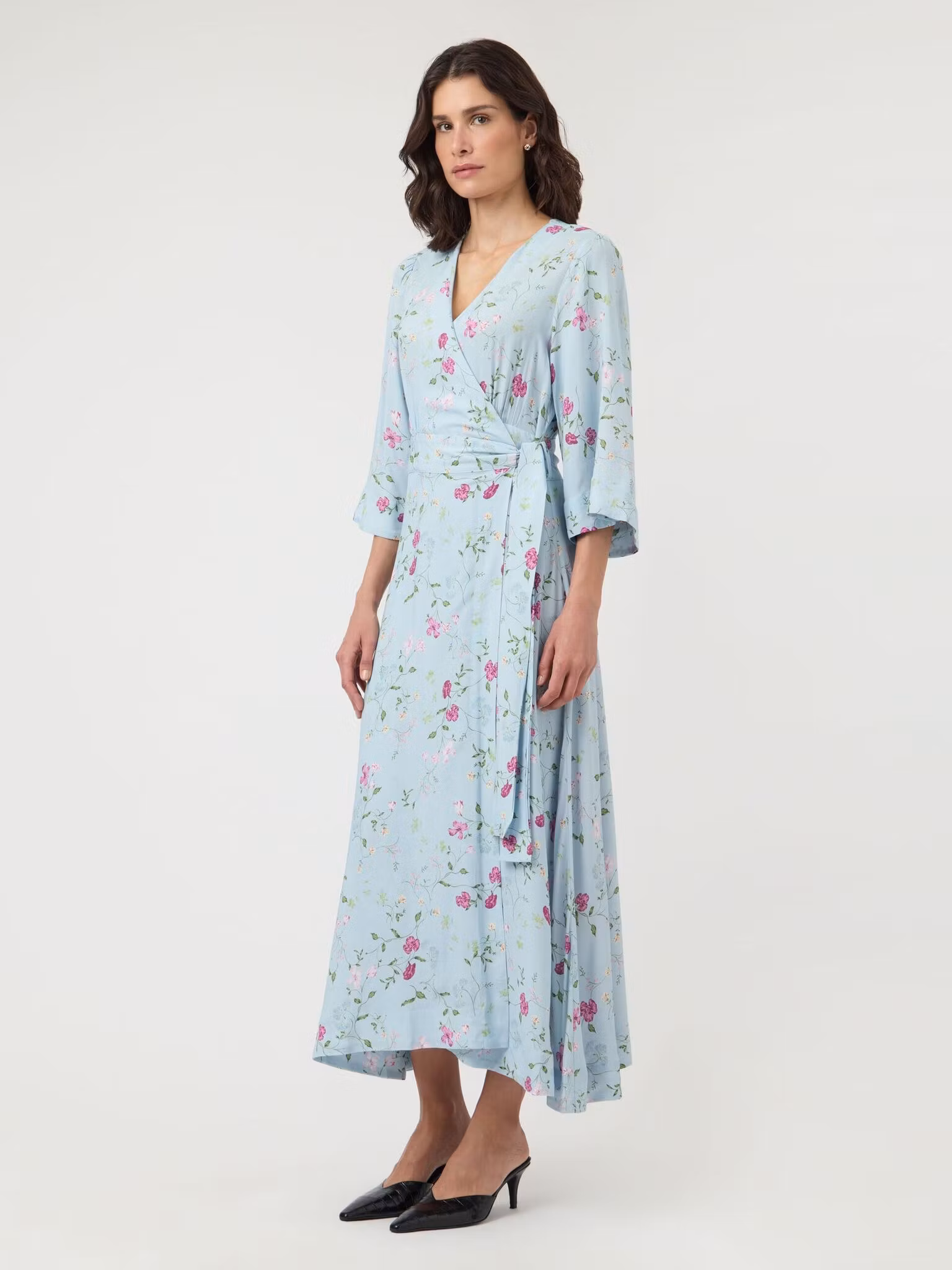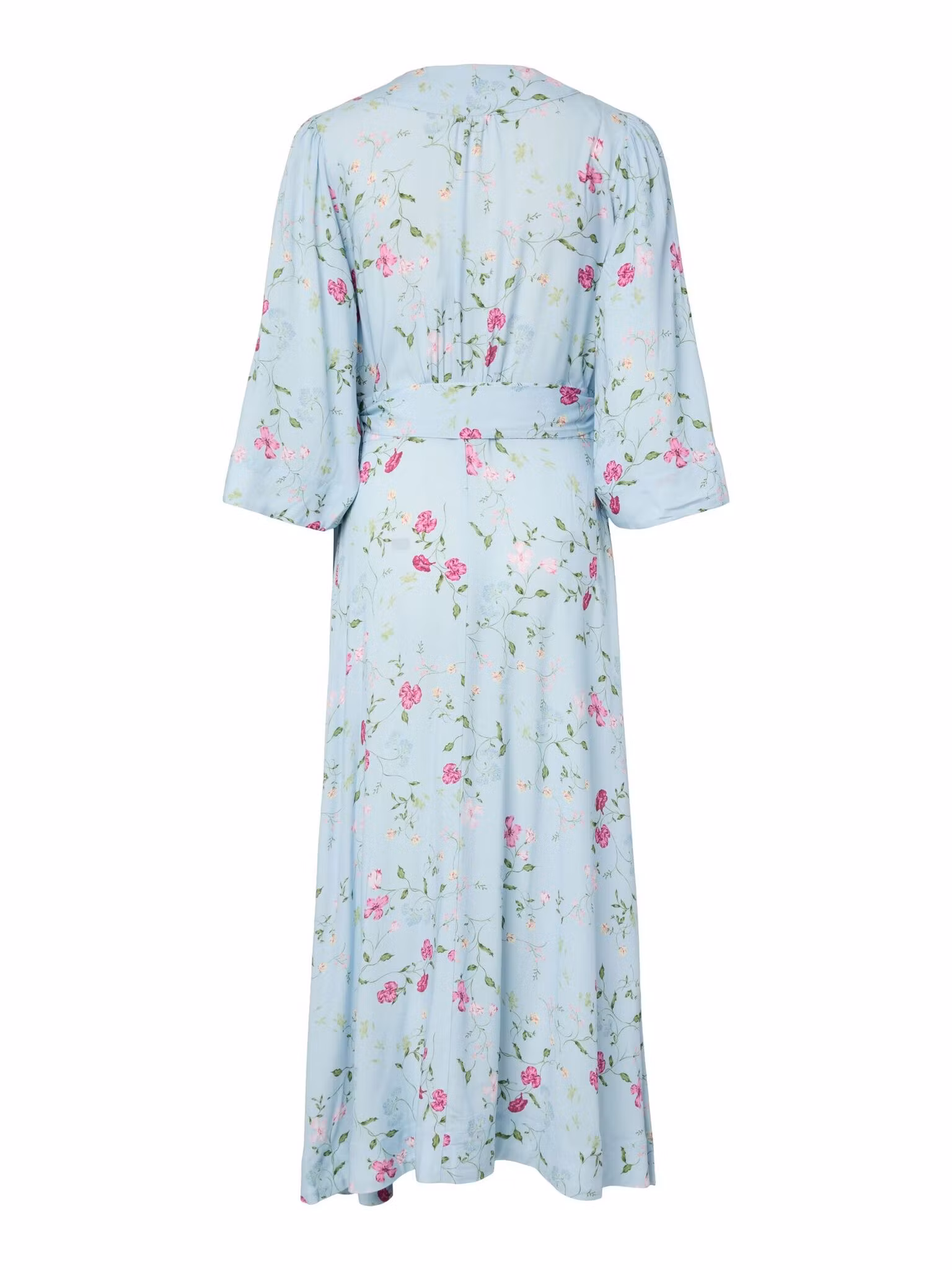 En alldeles magiskt vacker omlottklänning i viscose. Ljuvligt himmelsblåbotten med mönster av sommarängens blommor i rosa, cerise, gröna och gula nyanser. Knyts i sidan med ett brett band och ärmen är utställd och 3/4 dels lång med en bred manchett som avslut.