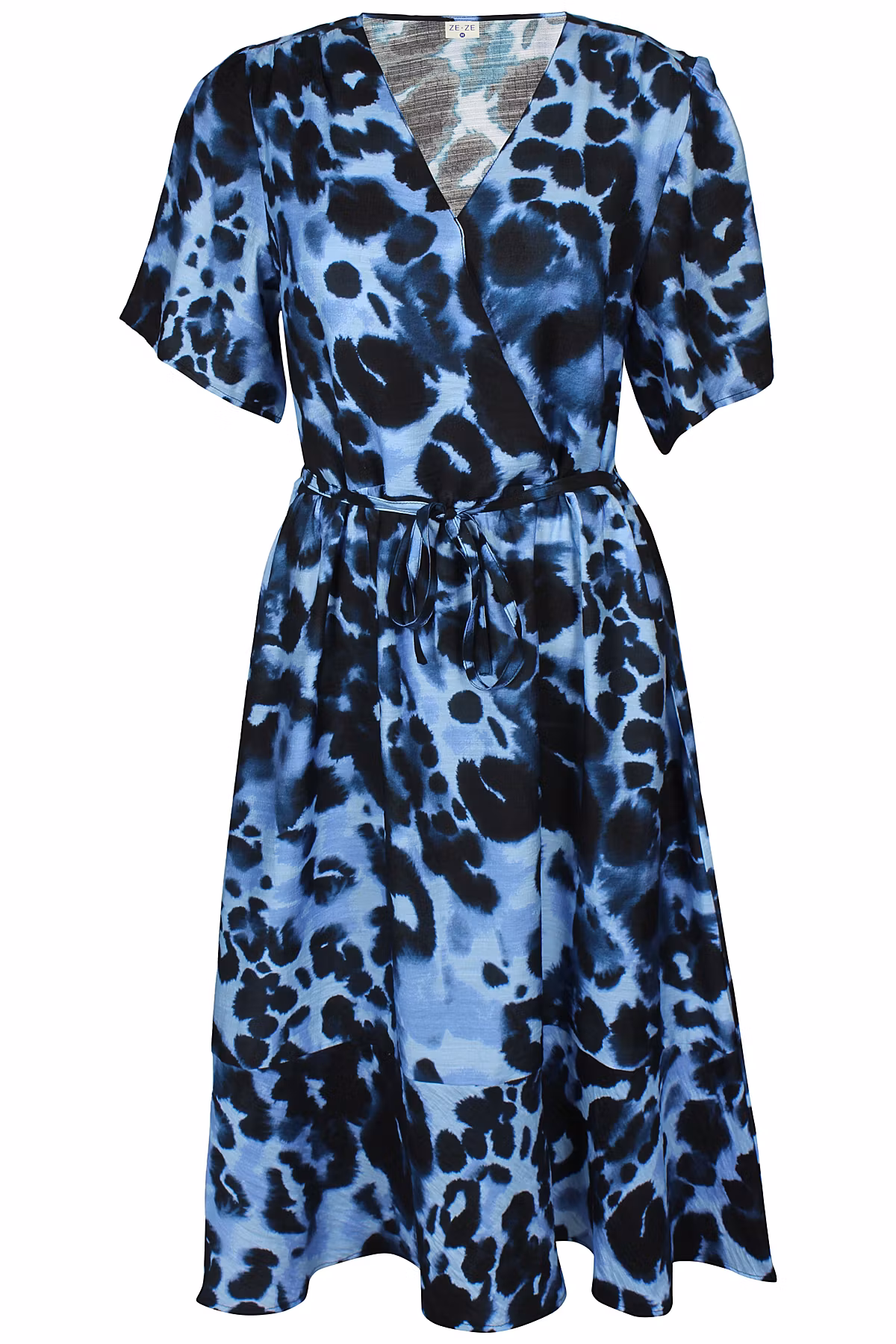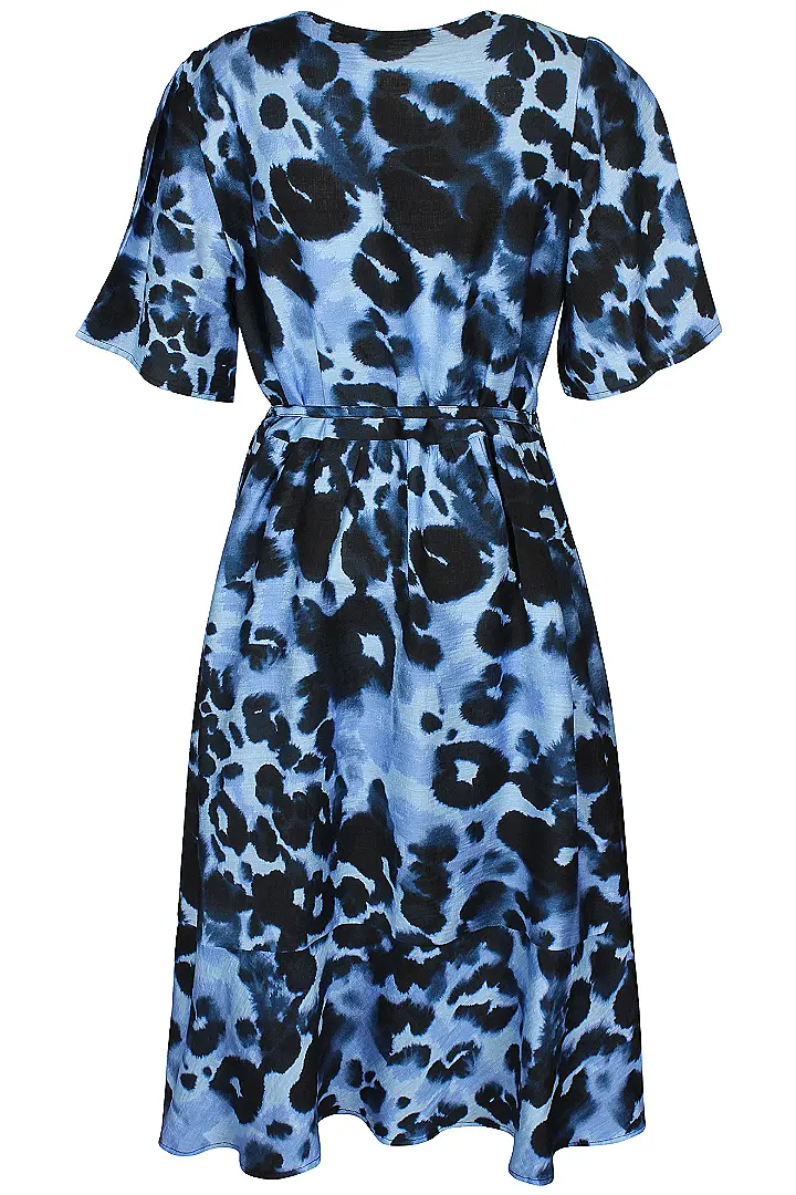 Söt blå klänning med leopardmönster. Slutar mitt på vaden. Falsk omlottskärning med v-ringning. Avskuren i midjan och avtagbart smalt knytband. Sitter med trådhällor. Kort vid ärm med lätt puff.