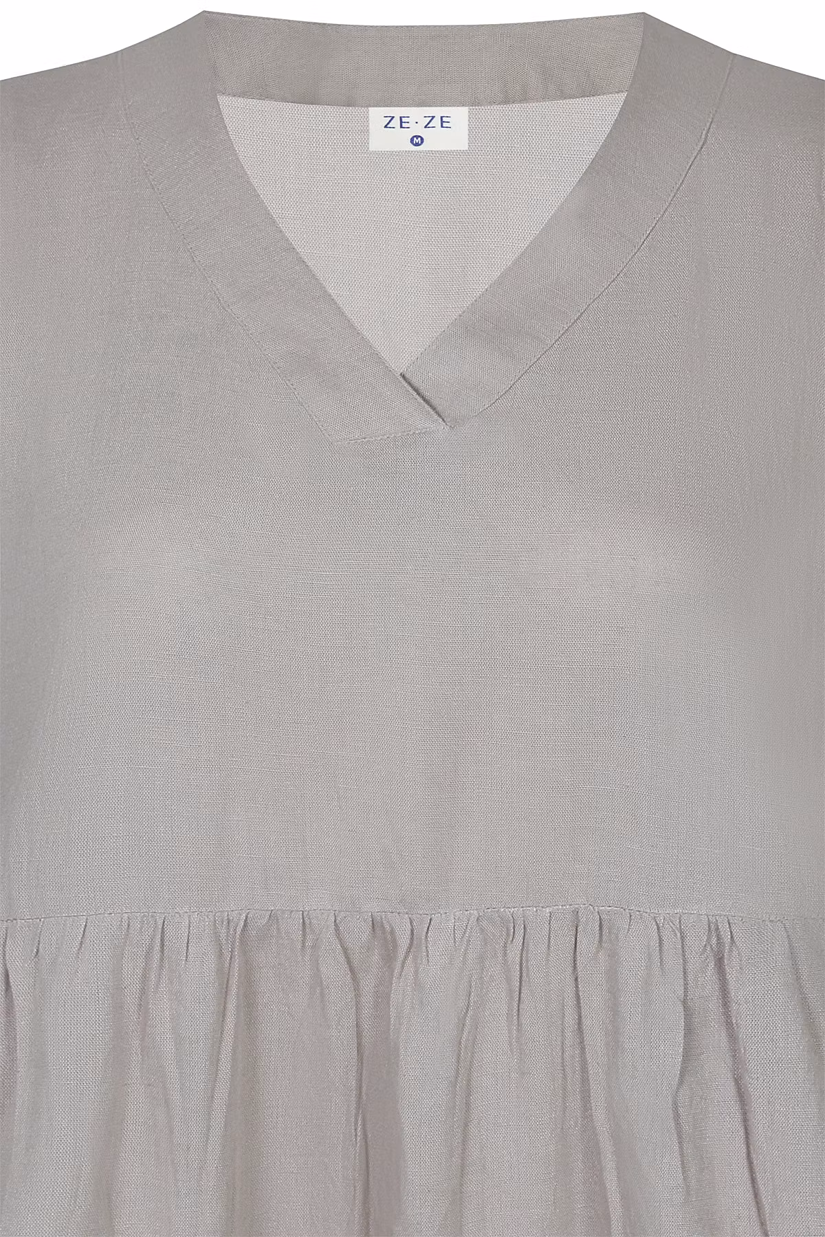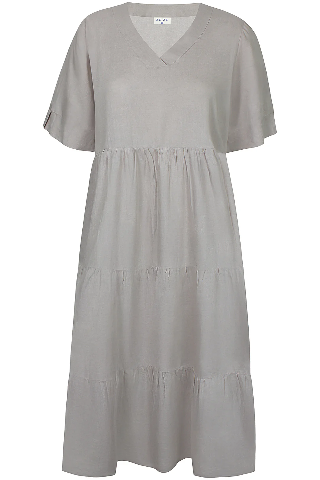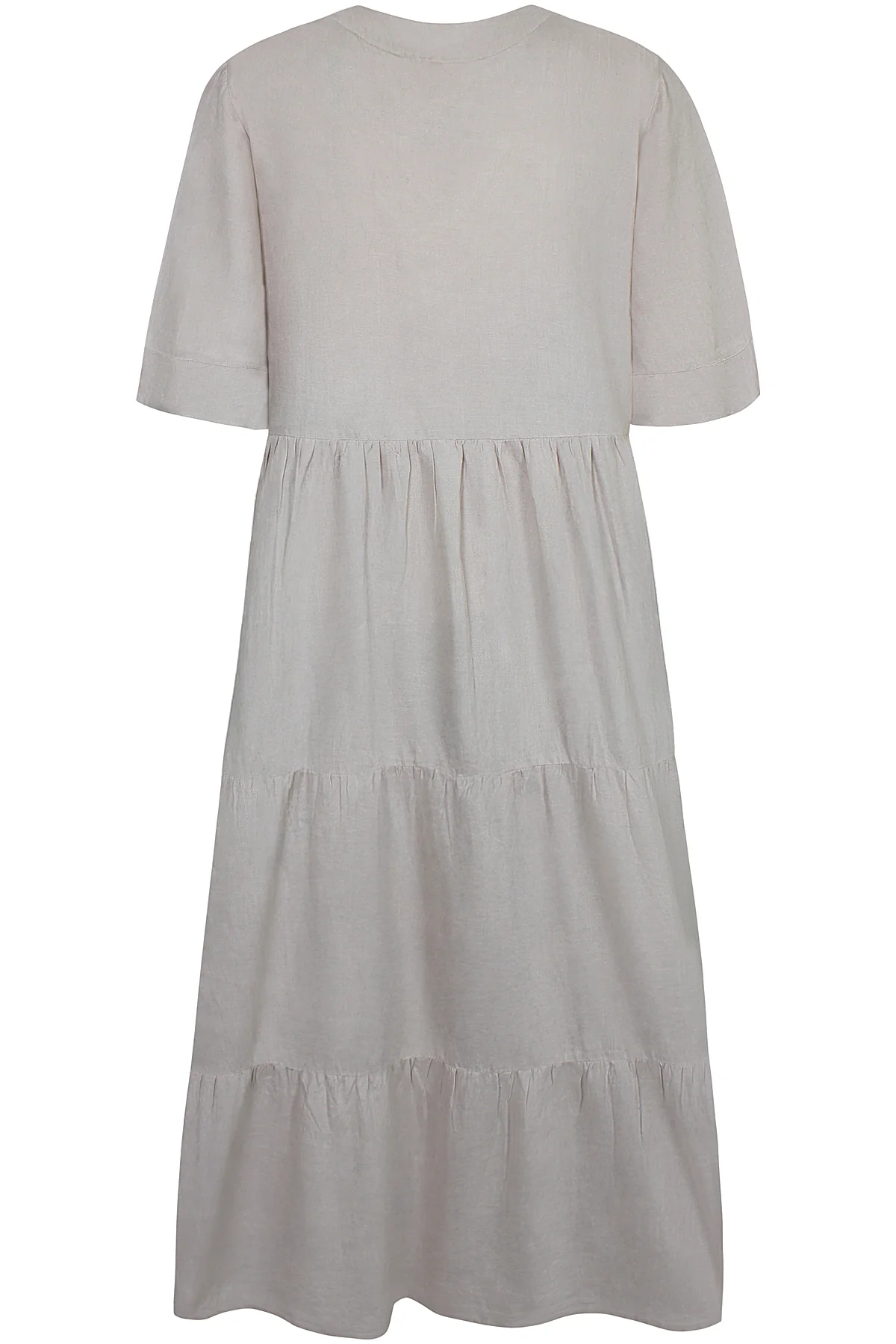 Fin sandfärgad maxiklänning. V-ringad fram och korta ärmar med liten slits. Klänningen har praktiska sidofickor och horisontella sömmar fram. Finns även i marinblått.