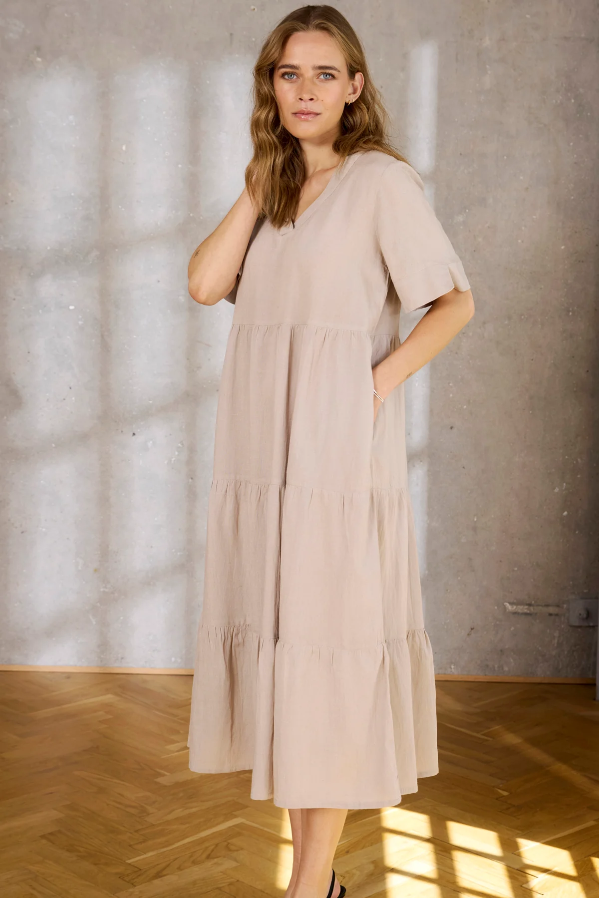 Fin sandfärgad maxiklänning. V-ringad fram och korta ärmar med liten slits. Klänningen har praktiska sidofickor och horisontella sömmar fram. Finns även i marin