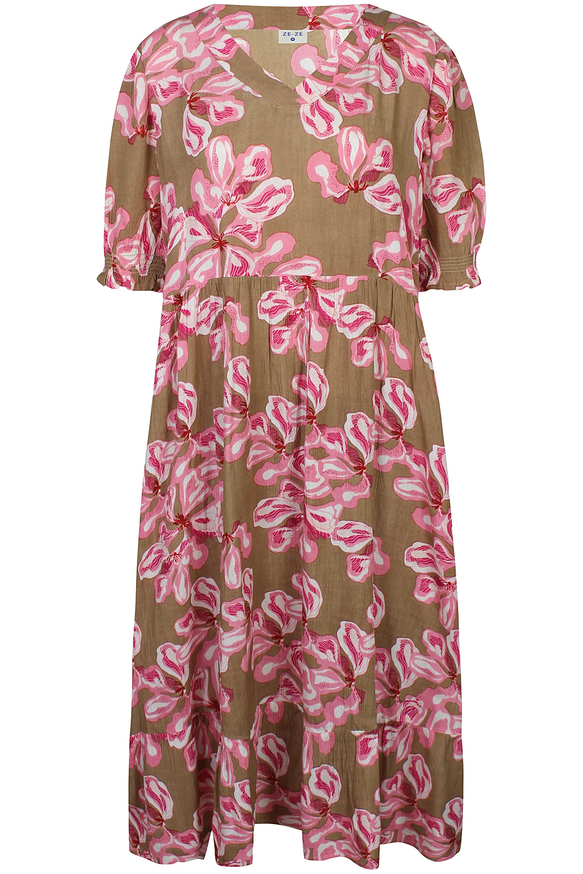 Snygg långklänning med ett heltäckande blommigt tryck i brunt och rosa. V-ringad fram och trekvartsärm med resår vid ärmslut. Fickor vid sidorna. Skärning vid midjan och utsvängd nedtill.