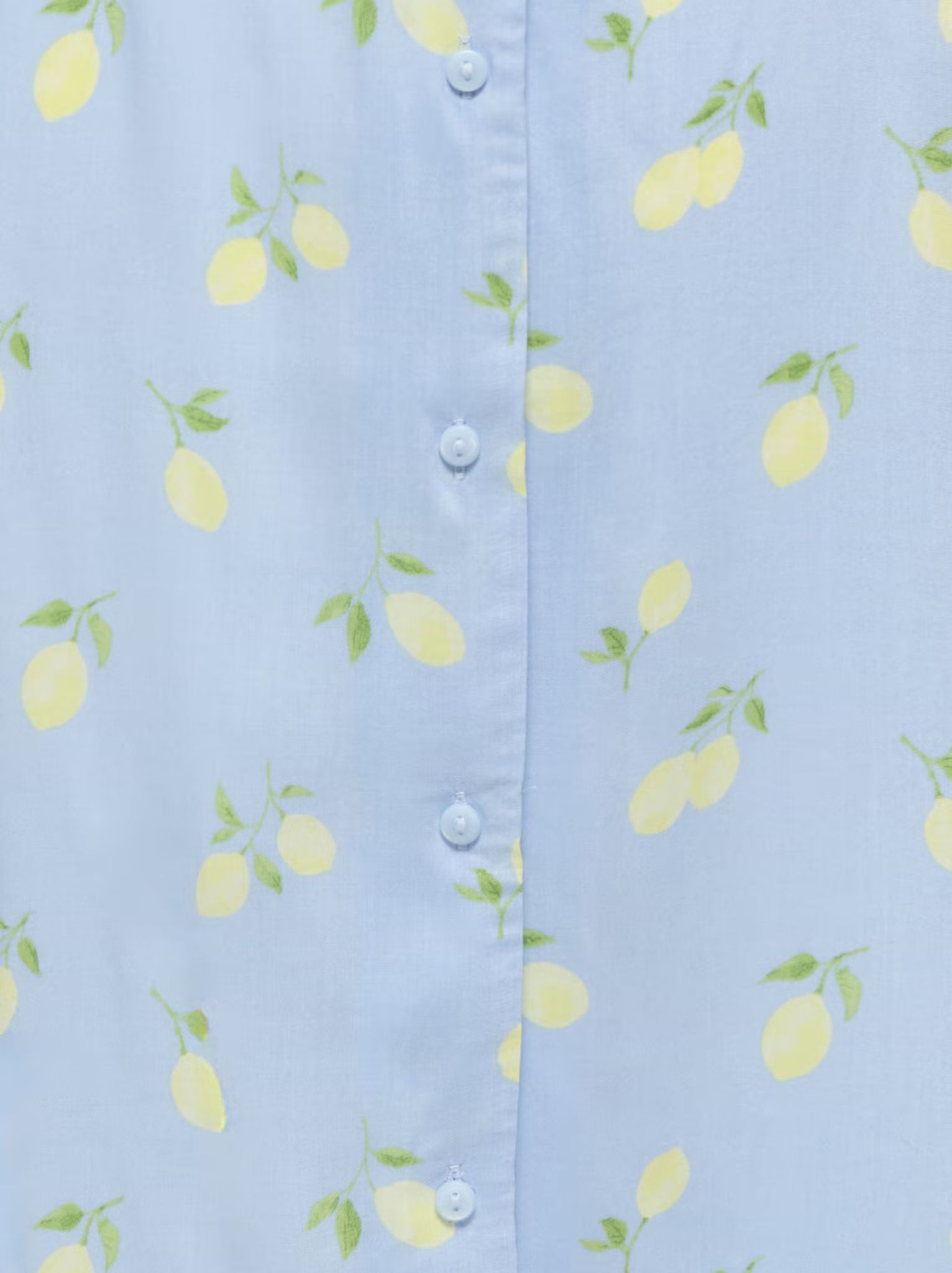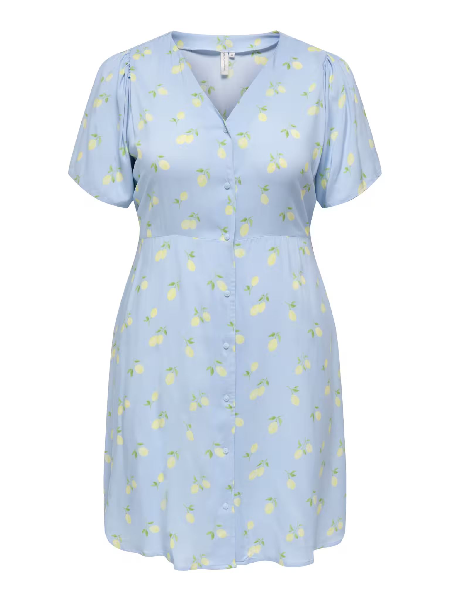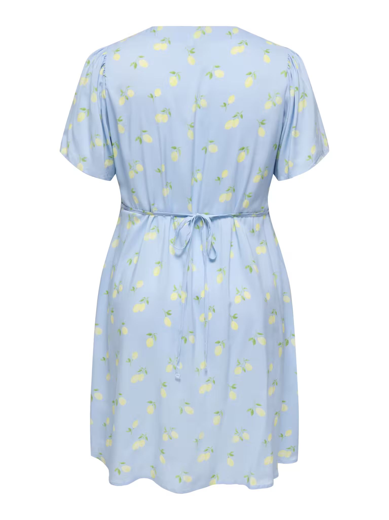 Söt blå midiklänning med citroner V-ringad fram och genomknäppt modell. Knytband runt midjan och kort fjärilsärm.