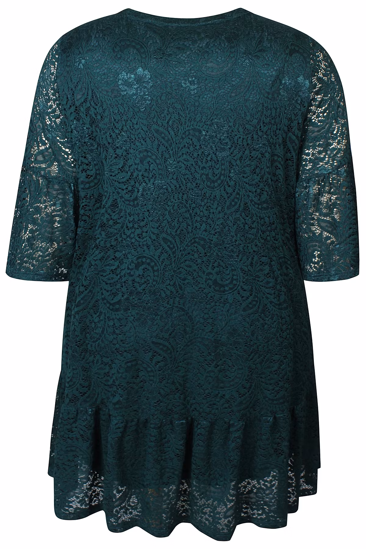 Härlig mörkgrön spetsklänning med lätt volang nedtill. Trekvartärm med fjärilsärm. V-ringad hals och insydd underklänning.